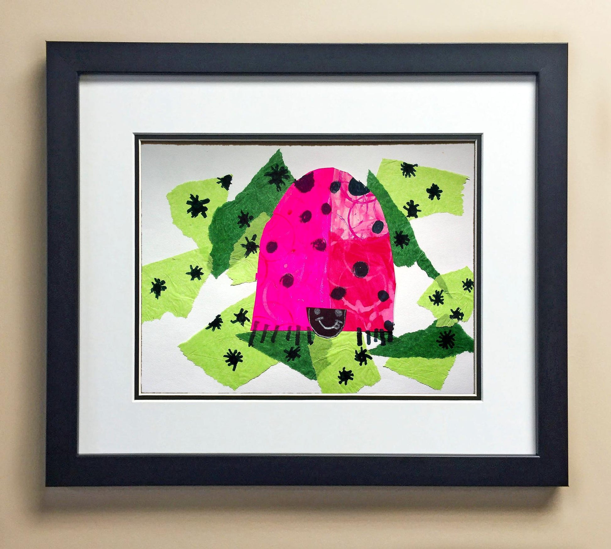 Included with the purchase is the Students Artwork, Frame, double matboard, shatter proof plexiglass, and a ready to hang backerboard with turnbuttons