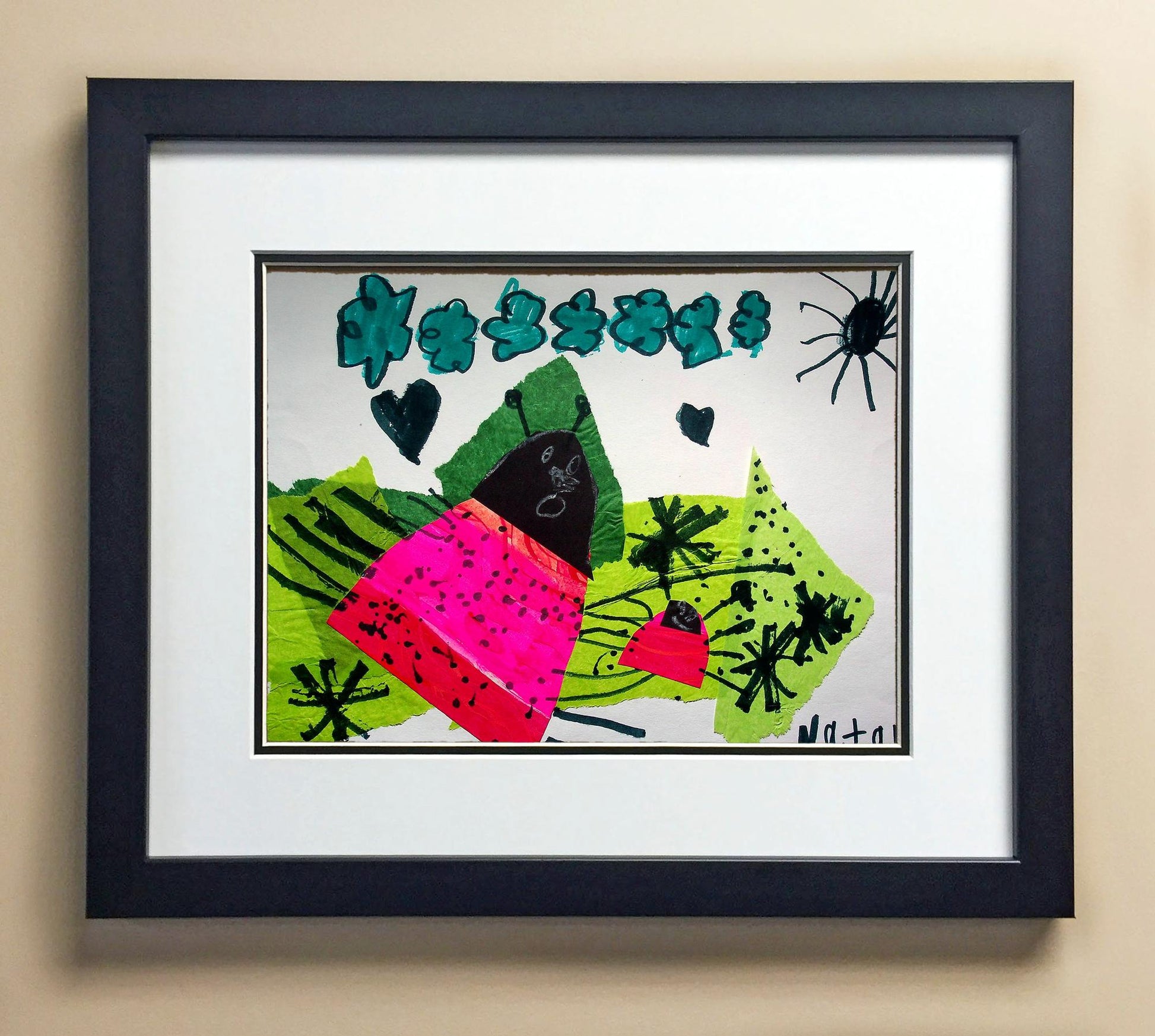 Included with the purchase is the Students Artwork, Frame, double matboard, shatter proof plexiglass, and a ready to hang backerboard with turnbuttons