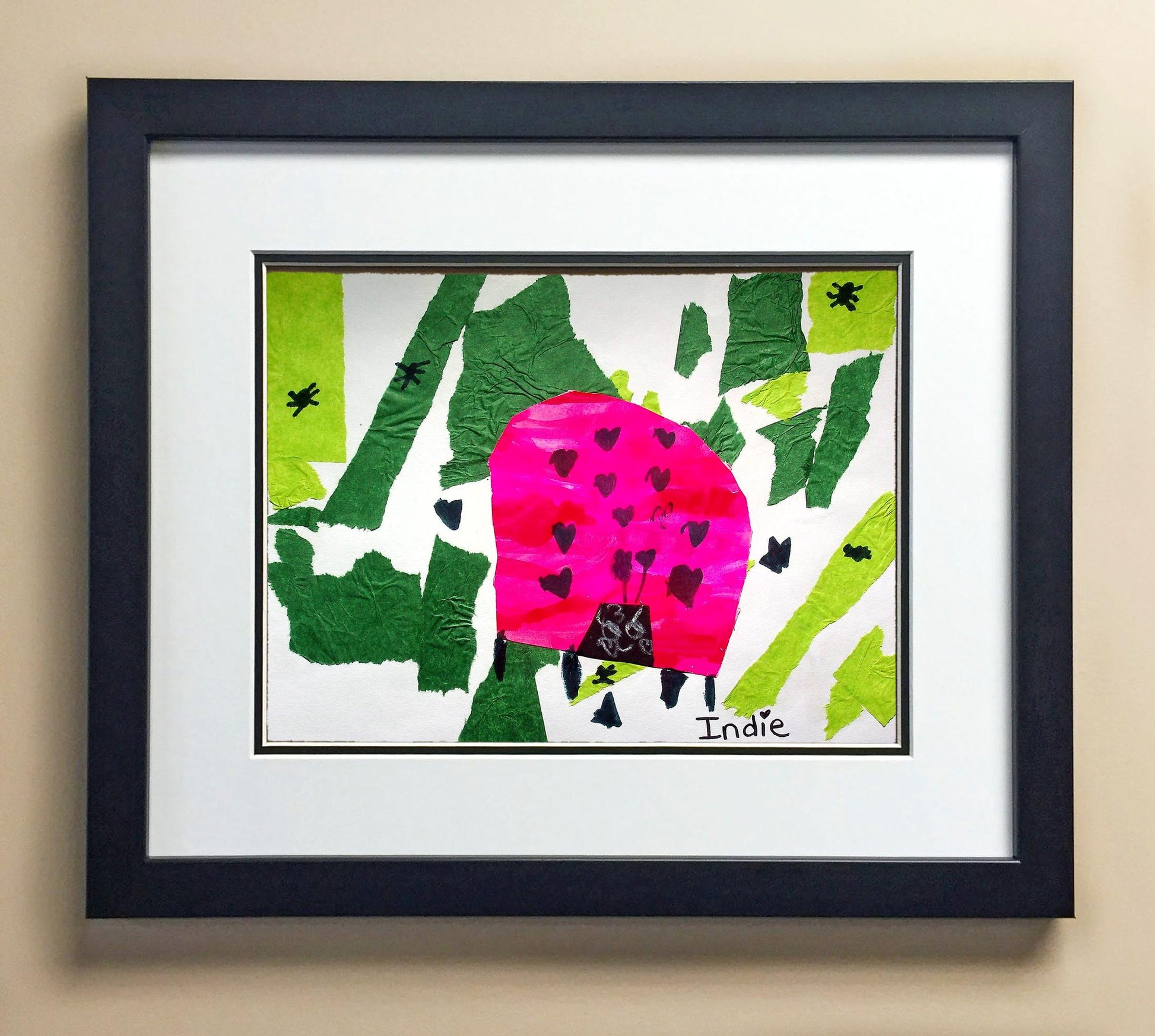 Included with the purchase is the Students Artwork, Frame, double matboard, shatter proof plexiglass, and a ready to hang backerboard with turnbuttons