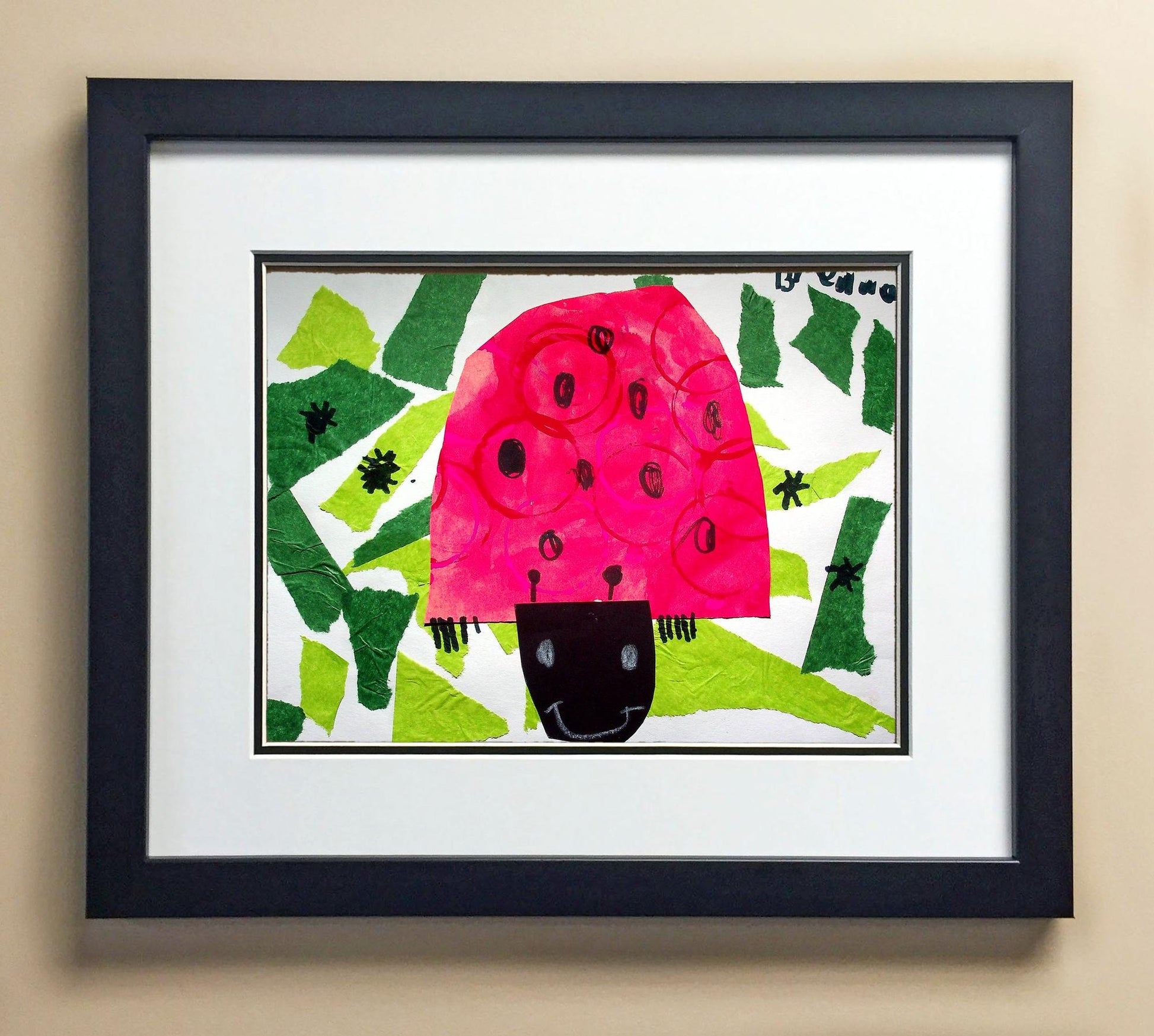 Included with the purchase is the Students Artwork, Frame, double matboard, shatter proof plexiglass, and a ready to hang backerboard with turnbuttons
