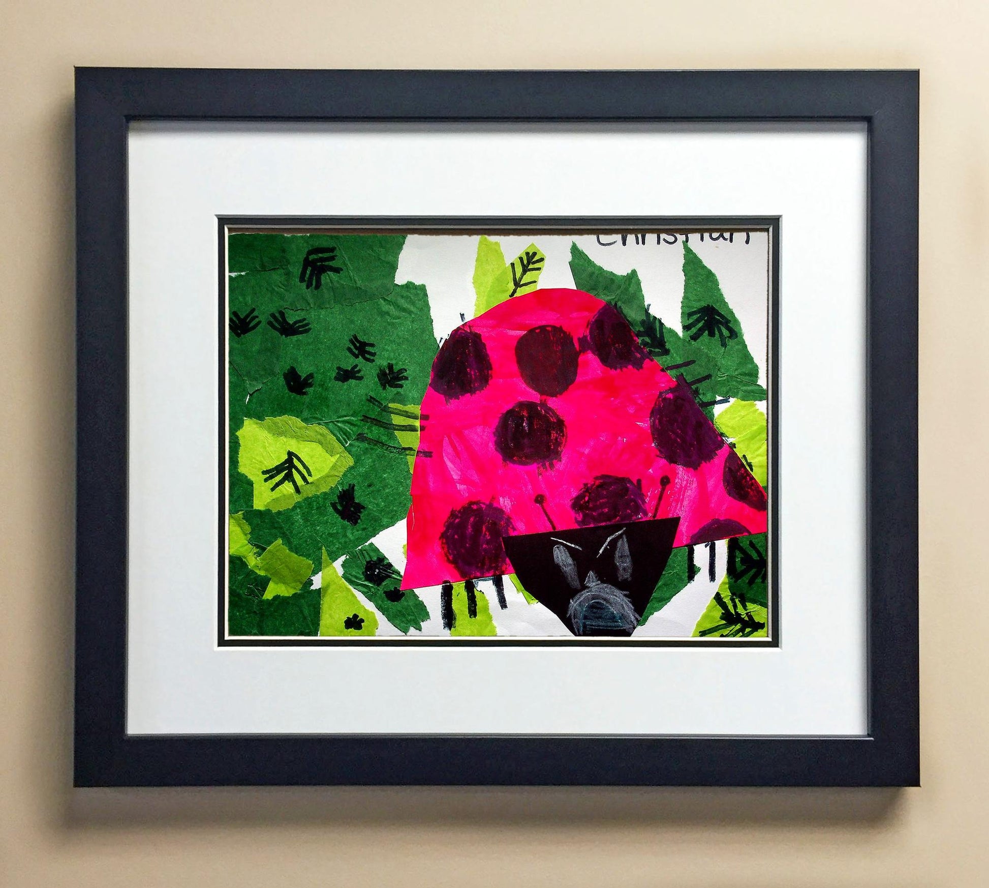 Included with the purchase is the Students Artwork, Frame, double matboard, shatter proof plexiglass, and a ready to hang backerboard with turnbuttons
