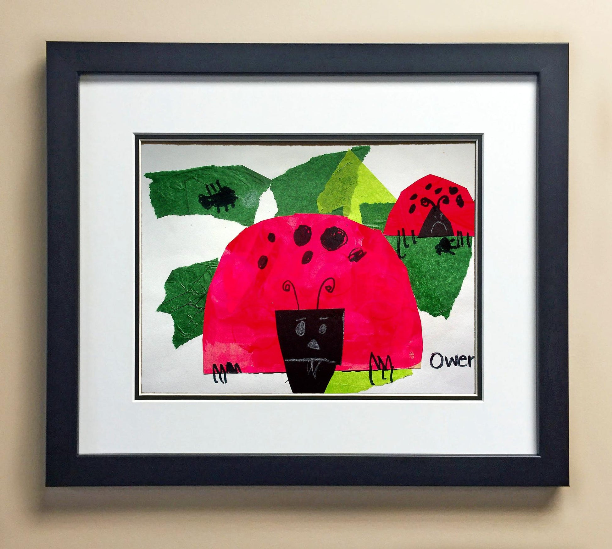 Included with the purchase is the Students Artwork, Frame, double matboard, shatter proof plexiglass, and a ready to hang backerboard with turnbuttons
