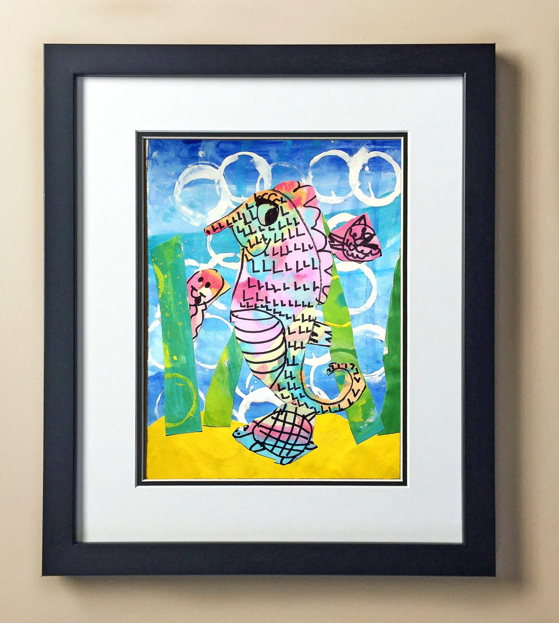 Included with the purchase is the Students Artwork, Frame, double matboard, shatter proof plexiglass, and a ready to hang backerboard with turnbuttons