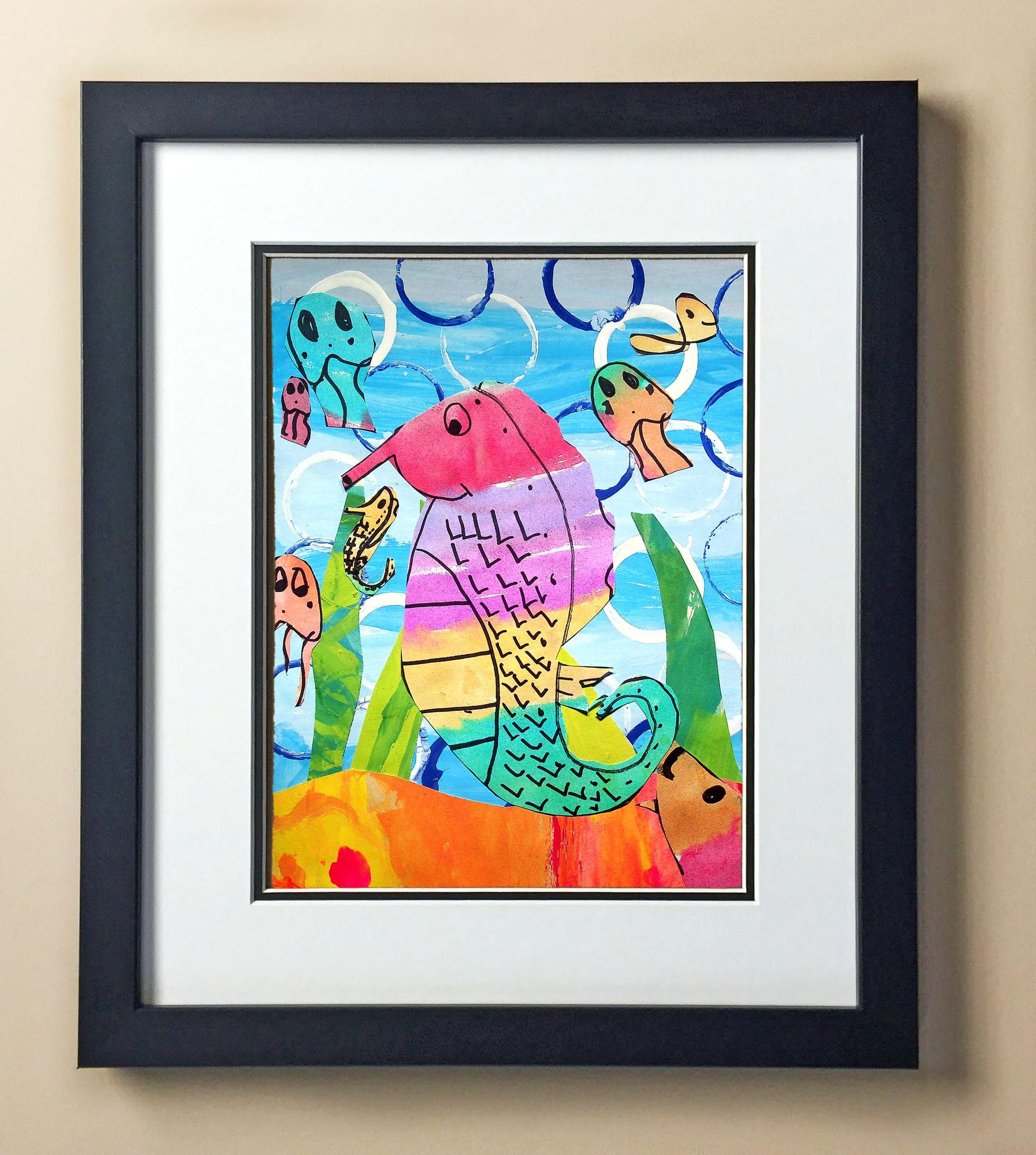 Included with the purchase is the Students Artwork, Frame, double matboard, shatter proof plexiglass, and a ready to hang backerboard with turnbuttons