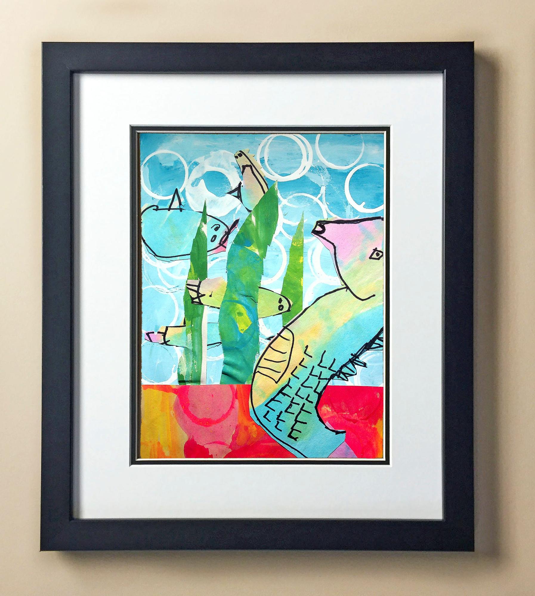 Included with the purchase is the Students Artwork, Frame, double matboard, shatter proof plexiglass, and a ready to hang backerboard with turnbuttons