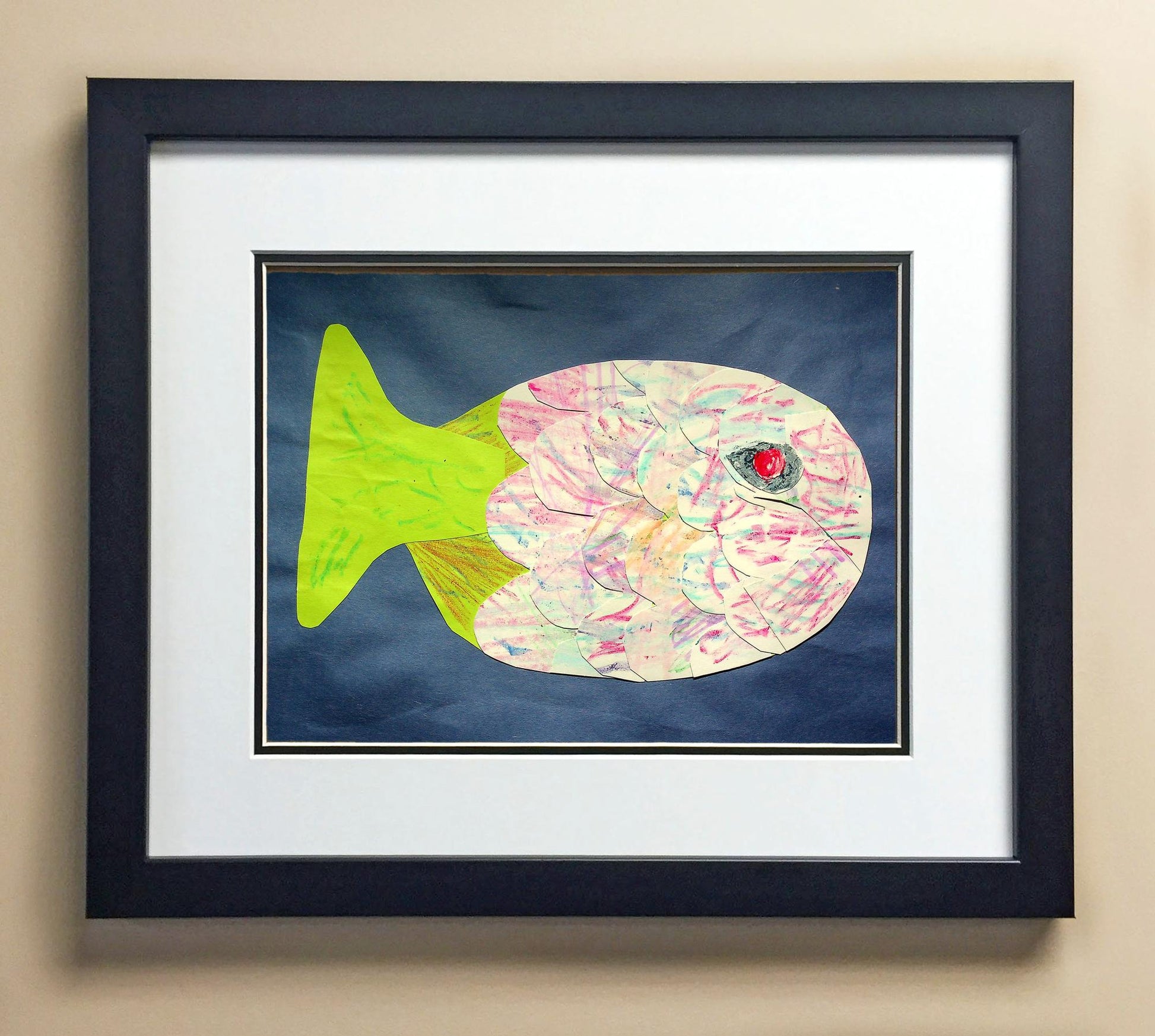 Included with the purchase is the Students Artwork, Frame, double matboard, shatter proof plexiglass, and a ready to hang backerboard with turnbuttons