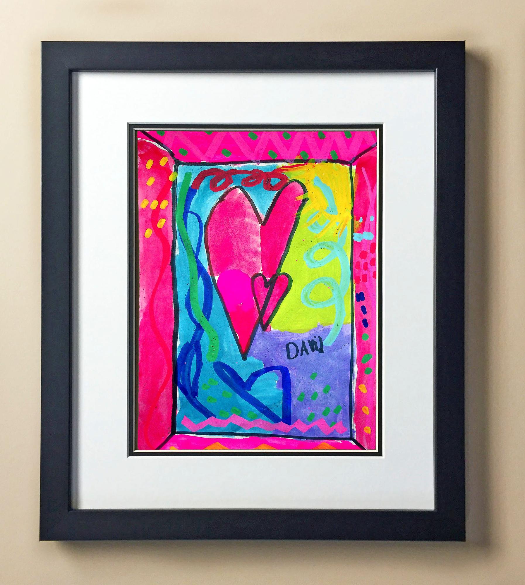 Included with the purchase is the Students Artwork, Frame, double matboard, shatter proof plexiglass, and a ready to hang backerboard with turnbuttons