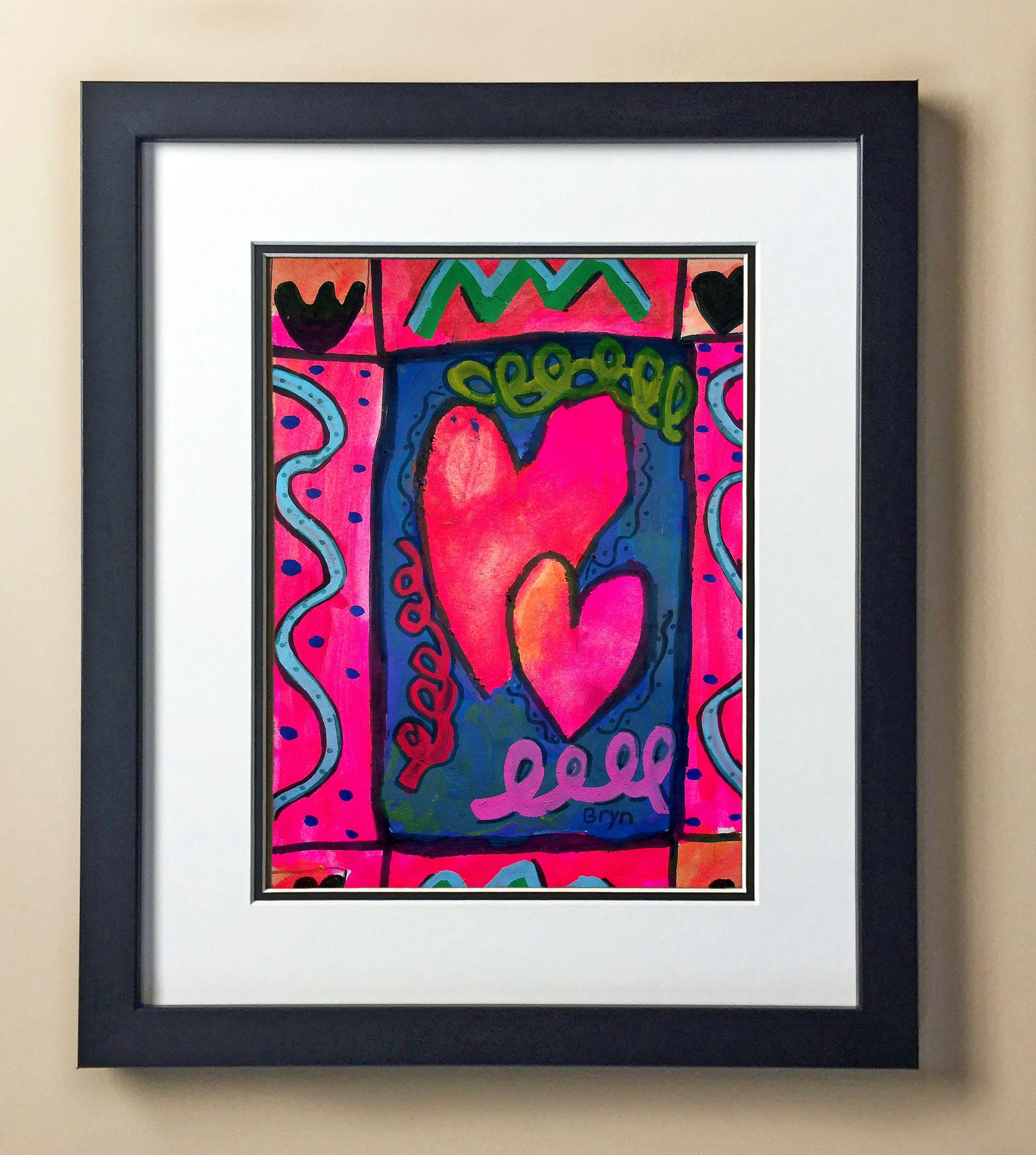 Included with the purchase is the Students Artwork, Frame, double matboard, shatter proof plexiglass, and a ready to hang backerboard with turnbuttons