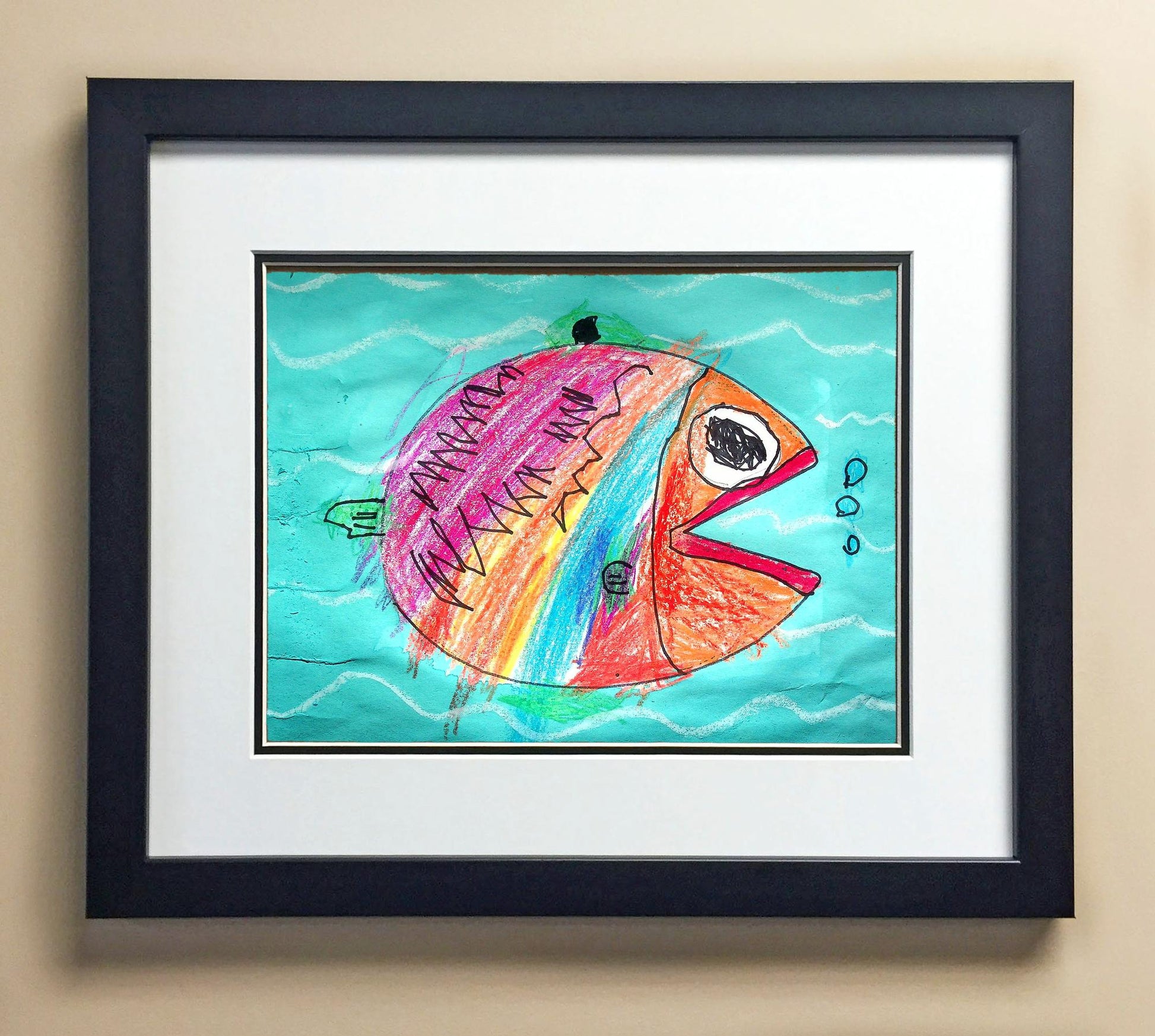 Included with the purchase is the Students Artwork, Frame, double matboard, shatter proof plexiglass, and a ready to hang backerboard with turnbuttons