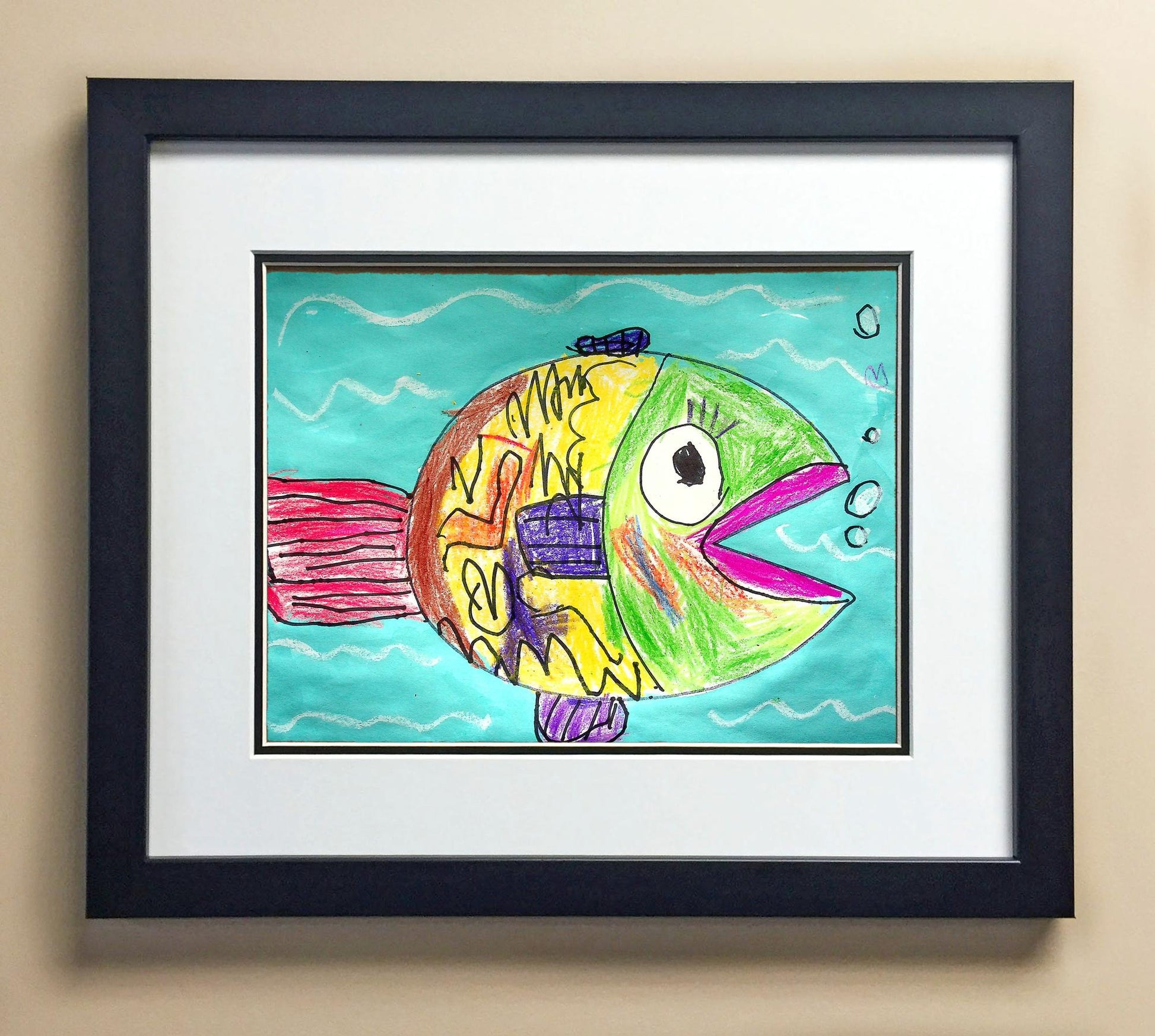 Included with the purchase is the Students Artwork, Frame, double matboard, shatter proof plexiglass, and a ready to hang backerboard with turnbuttons