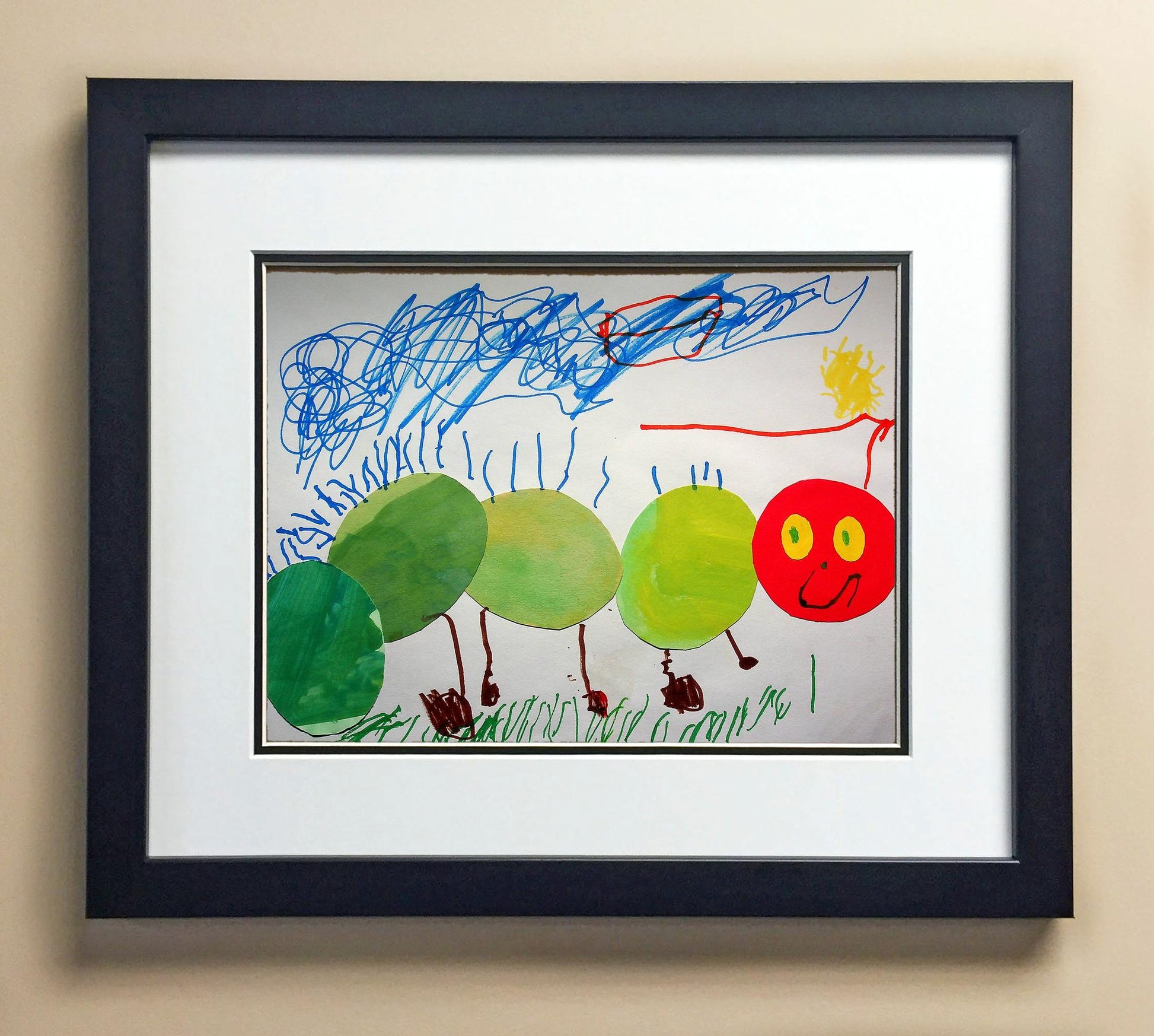 Included with the purchase is the Students Artwork, Frame, double matboard, shatter proof plexiglass, and a ready to hang backerboard with turnbuttons