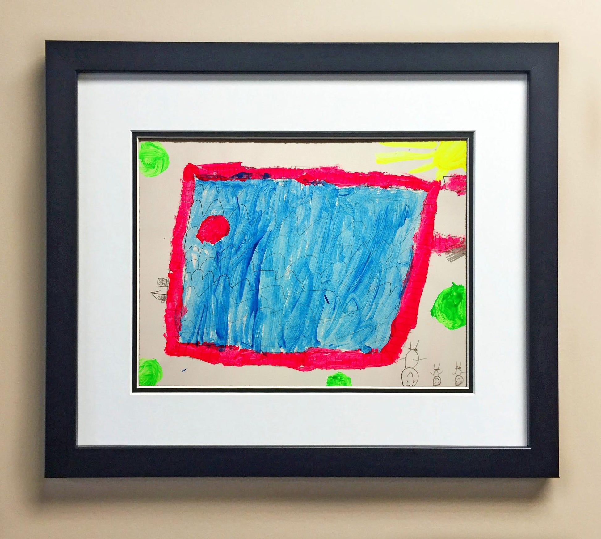 Included with the purchase is the Students Artwork, Frame, double matboard, shatter proof plexiglass, and a ready to hang backerboard with turnbuttons