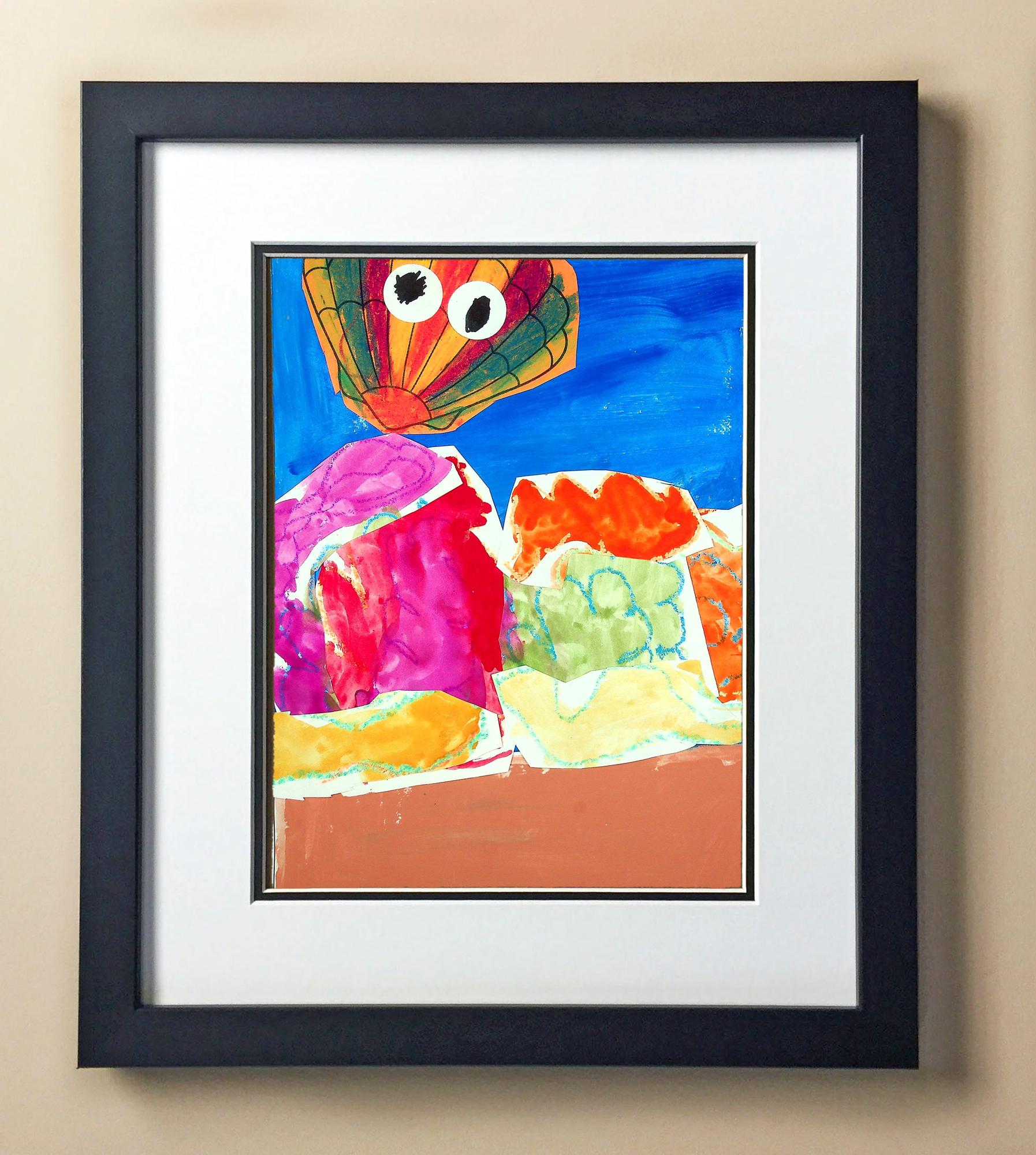 Included with the purchase is the Students Artwork, Frame, double matboard, shatter proof plexiglass, and a ready to hang backerboard with turnbuttons
