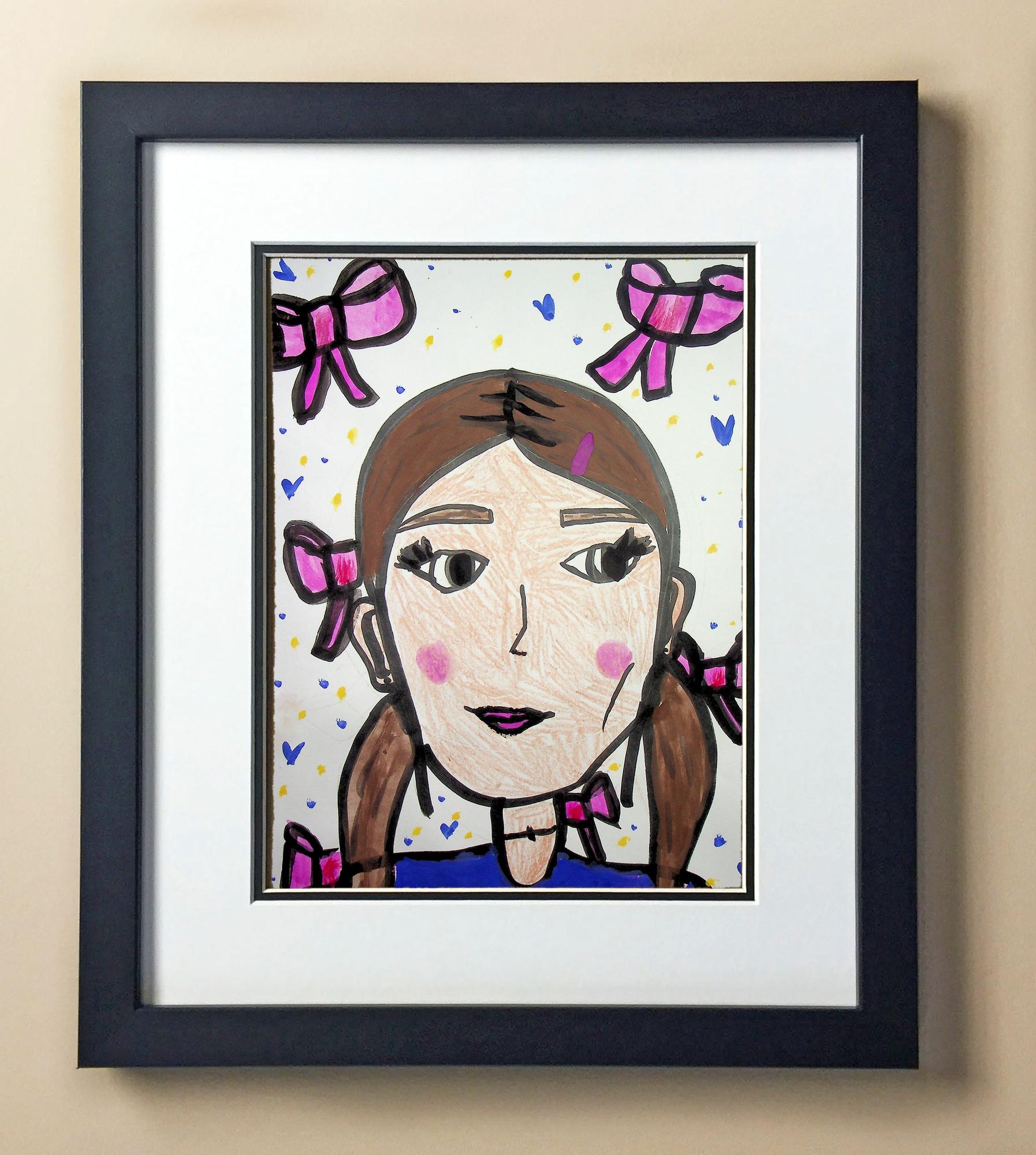 Included with the purchase is the Students Artwork, Frame, double matboard, shatter proof plexiglass, and a ready to hang backerboard with turnbuttons