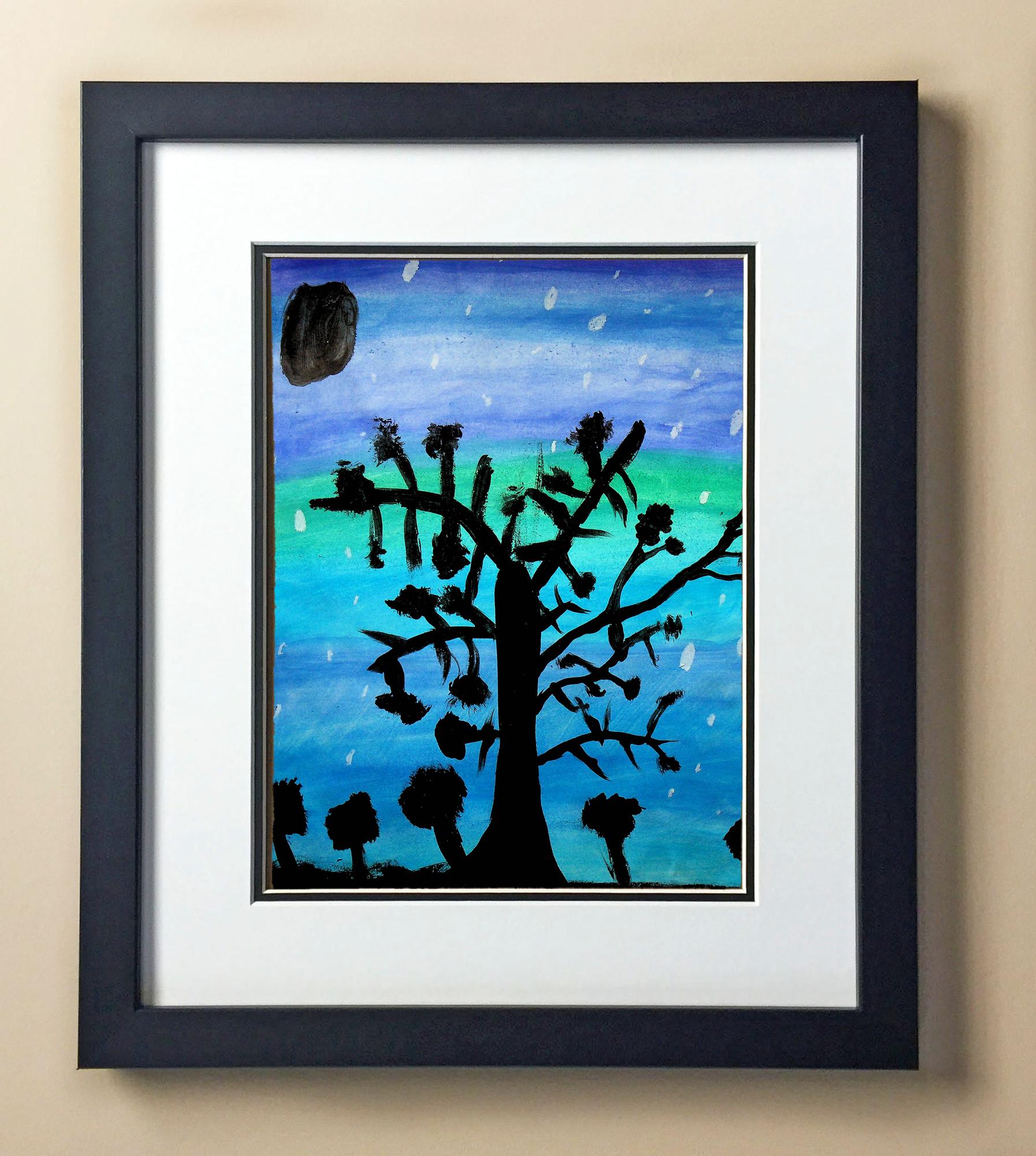 Included with the purchase is the Students Artwork, Frame, double matboard, shatter proof plexiglass, and a ready to hang backerboard with turnbuttons