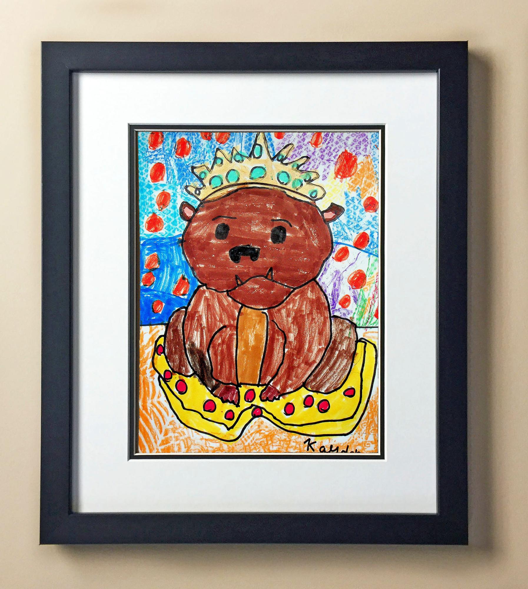 Included with the purchase is the Students Artwork, Frame, double matboard, shatter proof plexiglass, and a ready to hang backerboard with turnbuttons