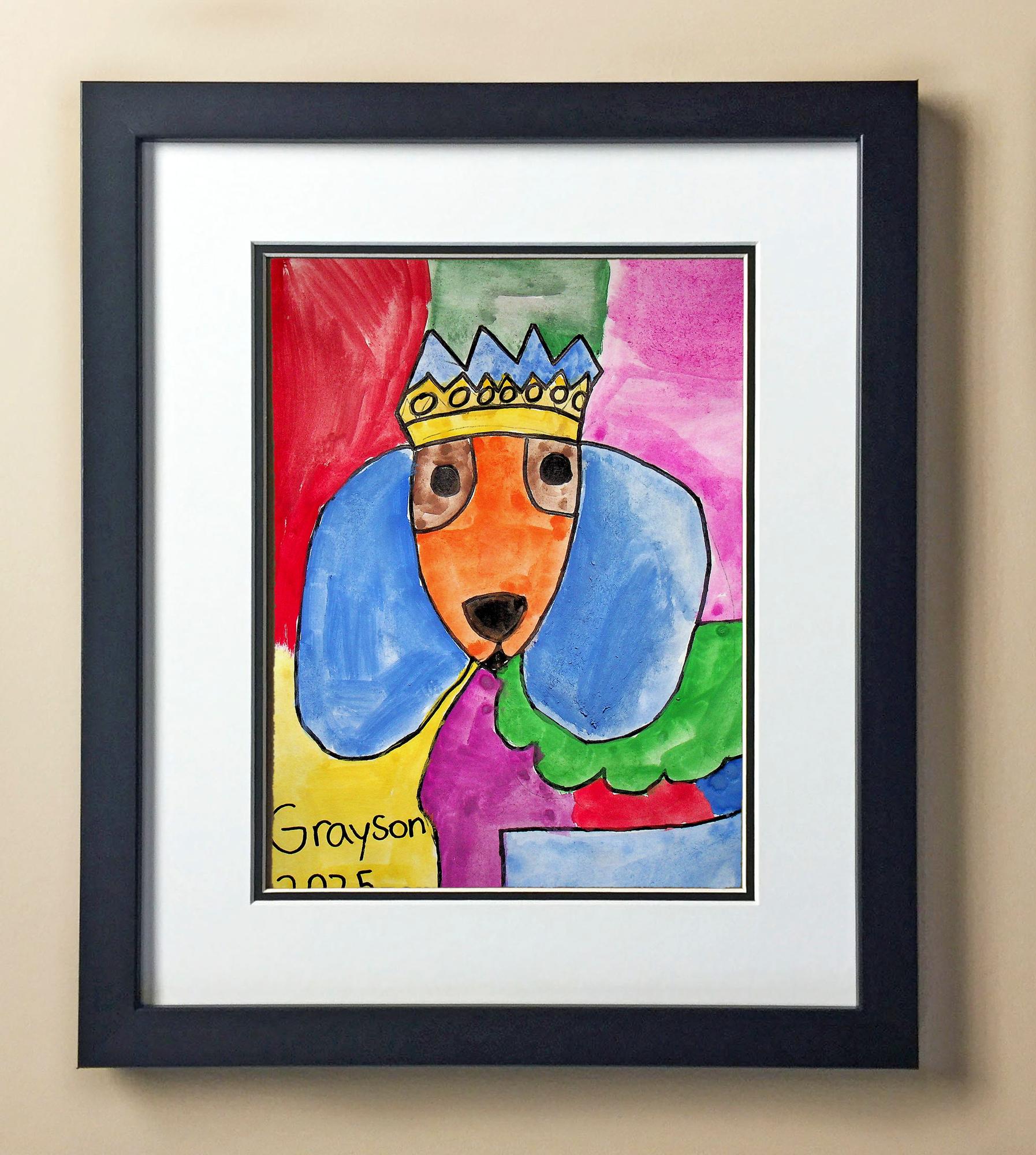 Included with the purchase is the Students Artwork, Frame, double matboard, shatter proof plexiglass, and a ready to hang backerboard with turnbuttons