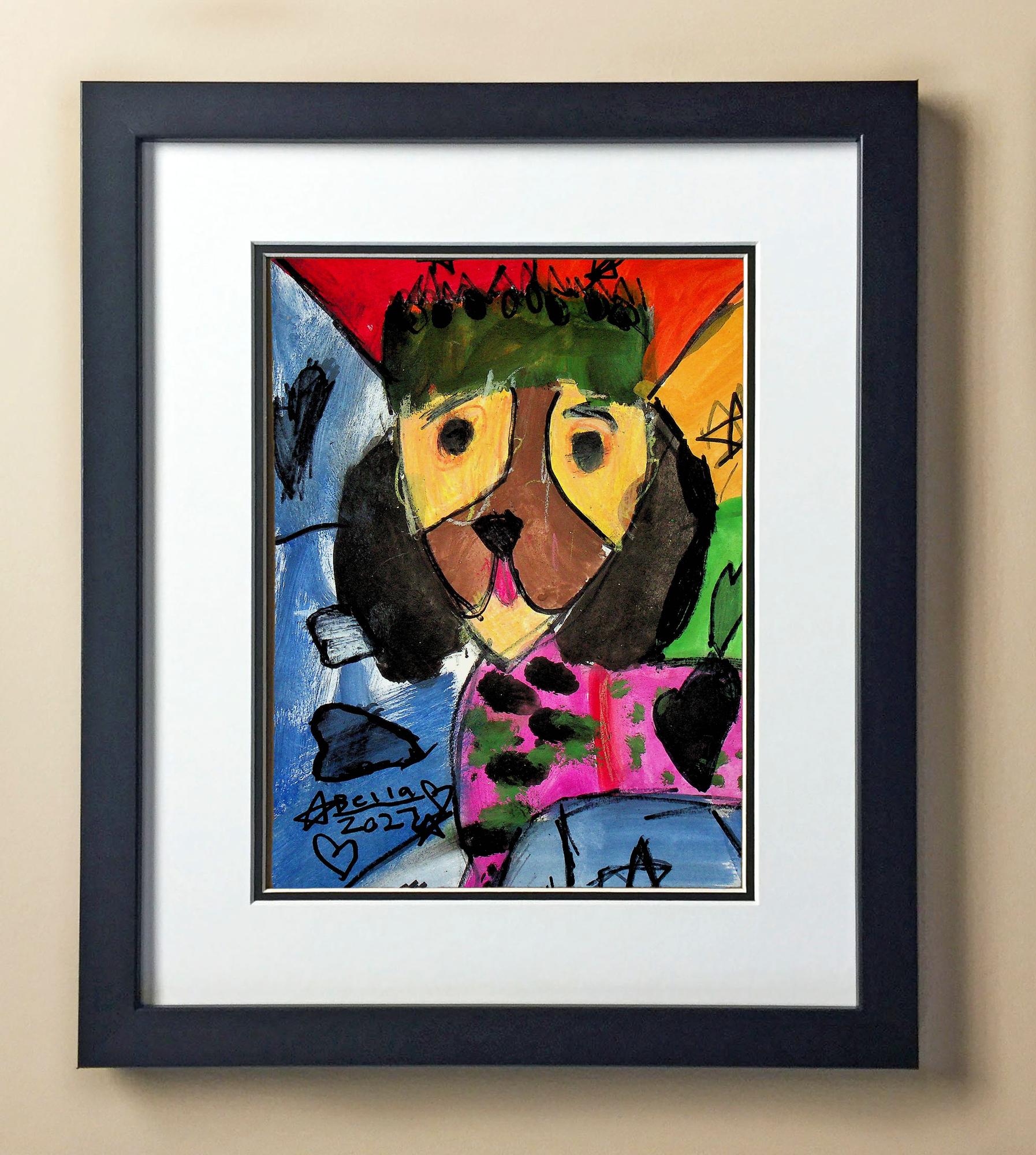 Included with the purchase is the Students Artwork, Frame, double matboard, shatter proof plexiglass, and a ready to hang backerboard with turnbuttons