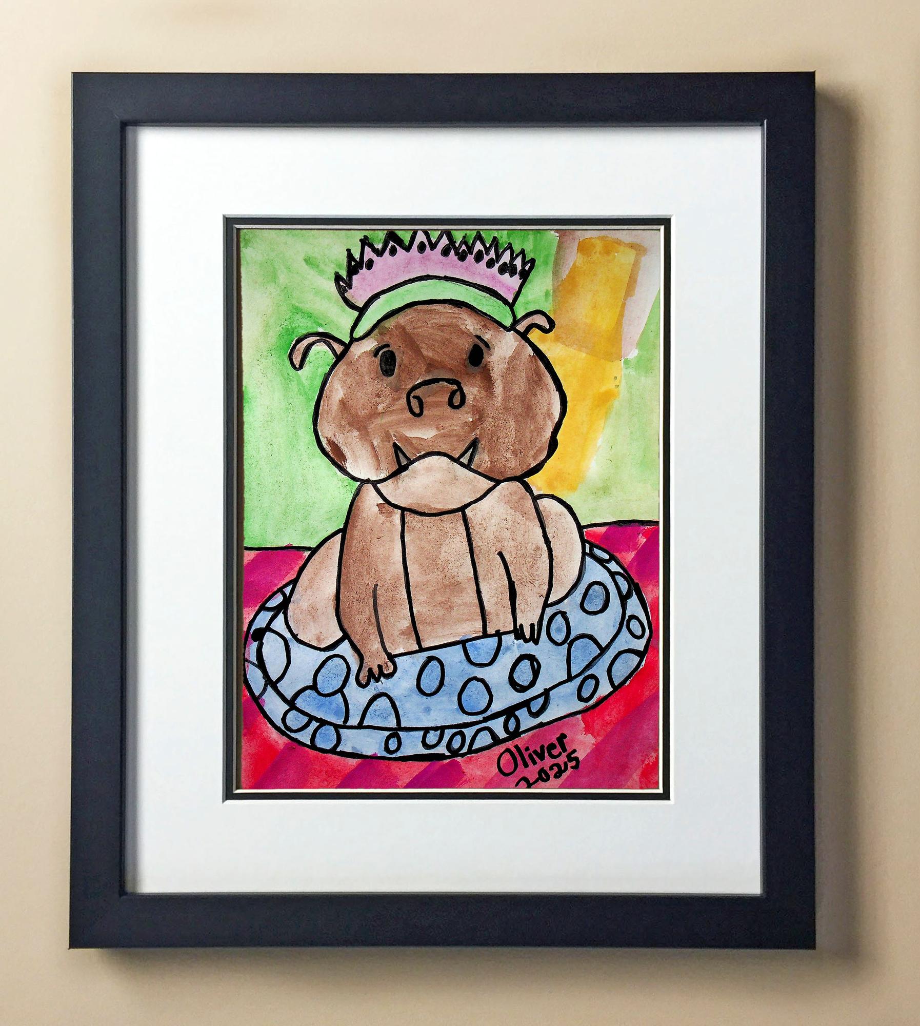 Included with the purchase is the Students Artwork, Frame, double matboard, shatter proof plexiglass, and a ready to hang backerboard with turnbuttons