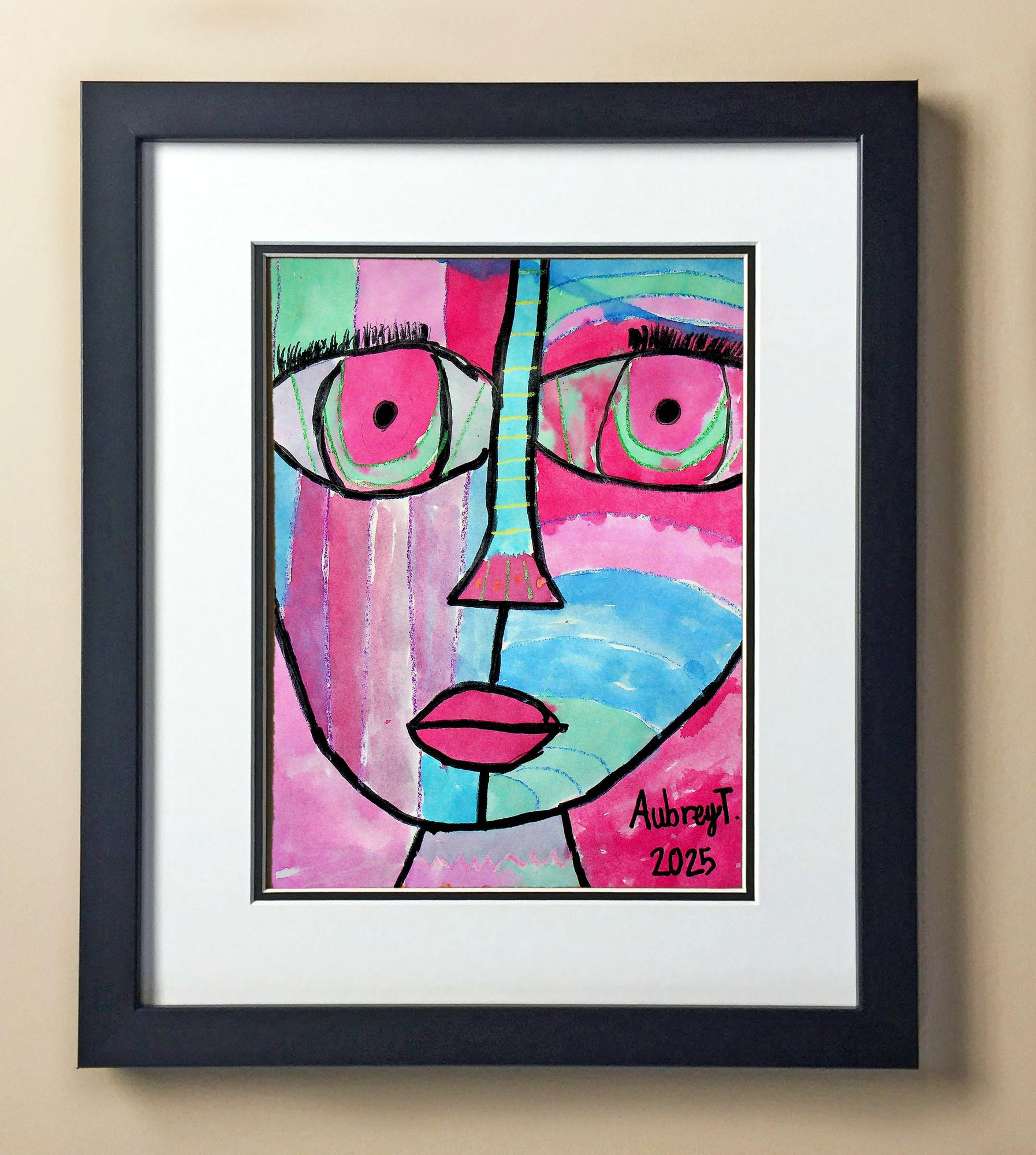 Included with the purchase is the Students Artwork, Frame, double matboard, shatter proof plexiglass, and a ready to hang backerboard with turnbuttons