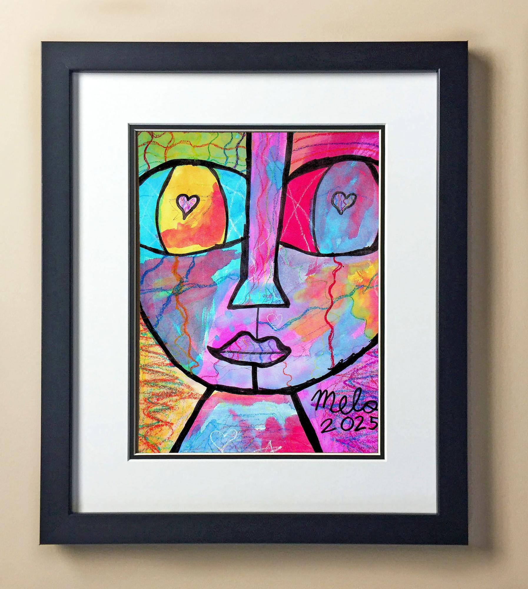 Included with the purchase is the Students Artwork, Frame, double matboard, shatter proof plexiglass, and a ready to hang backerboard with turnbuttons