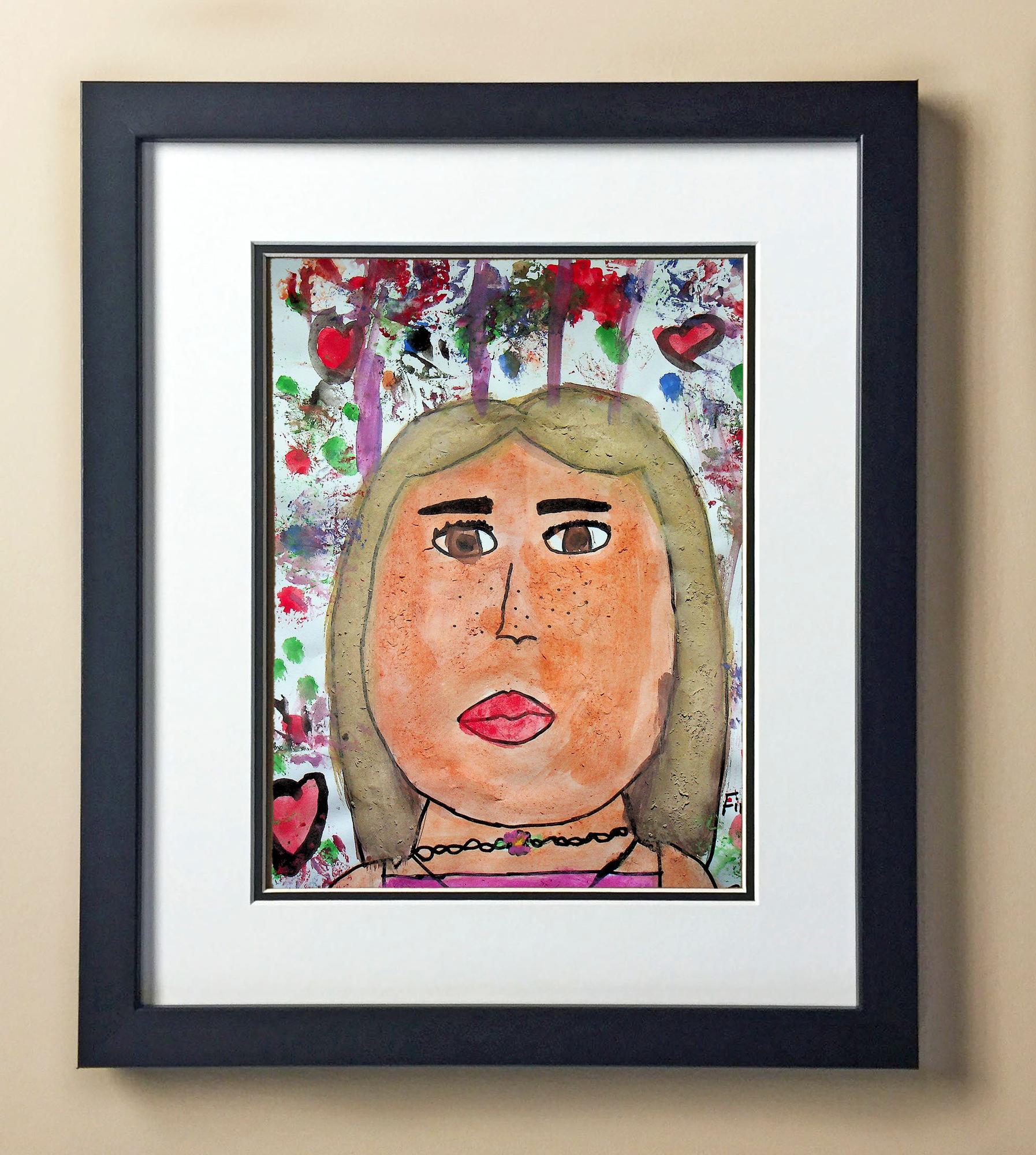 Included with the purchase is the Students Artwork, Frame, double matboard, shatter proof plexiglass, and a ready to hang backerboard with turnbuttons