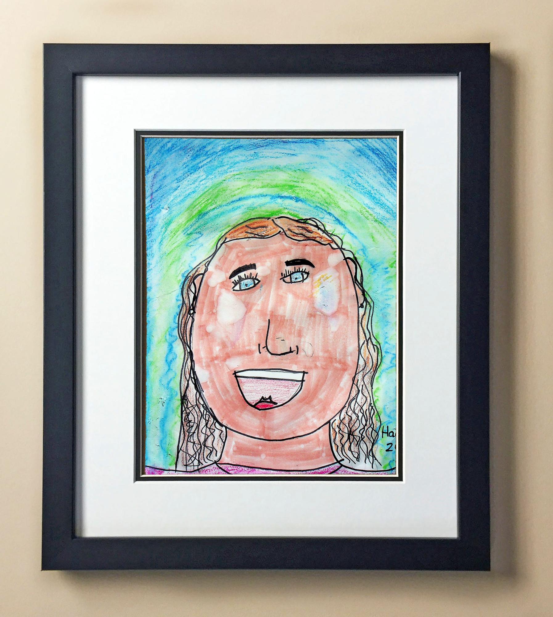 Included with the purchase is the Students Artwork, Frame, double matboard, shatter proof plexiglass, and a ready to hang backerboard with turnbuttons
