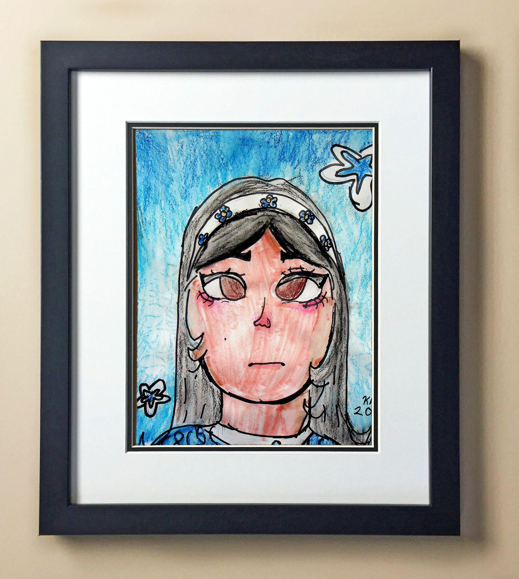 Included with the purchase is the Students Artwork, Frame, double matboard, shatter proof plexiglass, and a ready to hang backerboard with turnbuttons