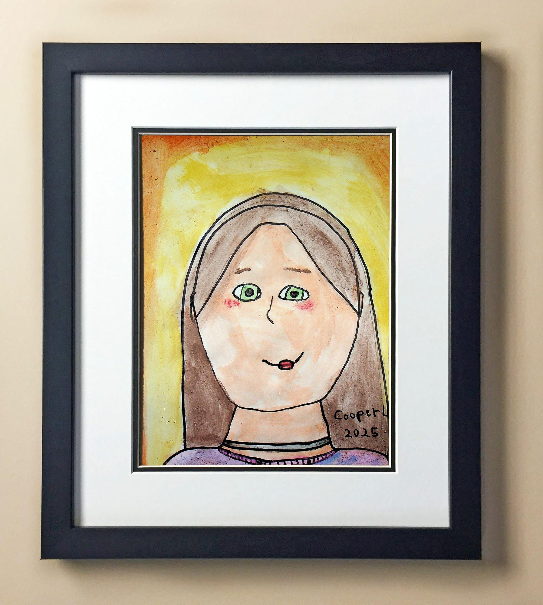 Included with the purchase is the Students Artwork, Frame, double matboard, shatter proof plexiglass, and a ready to hang backerboard with turnbuttons