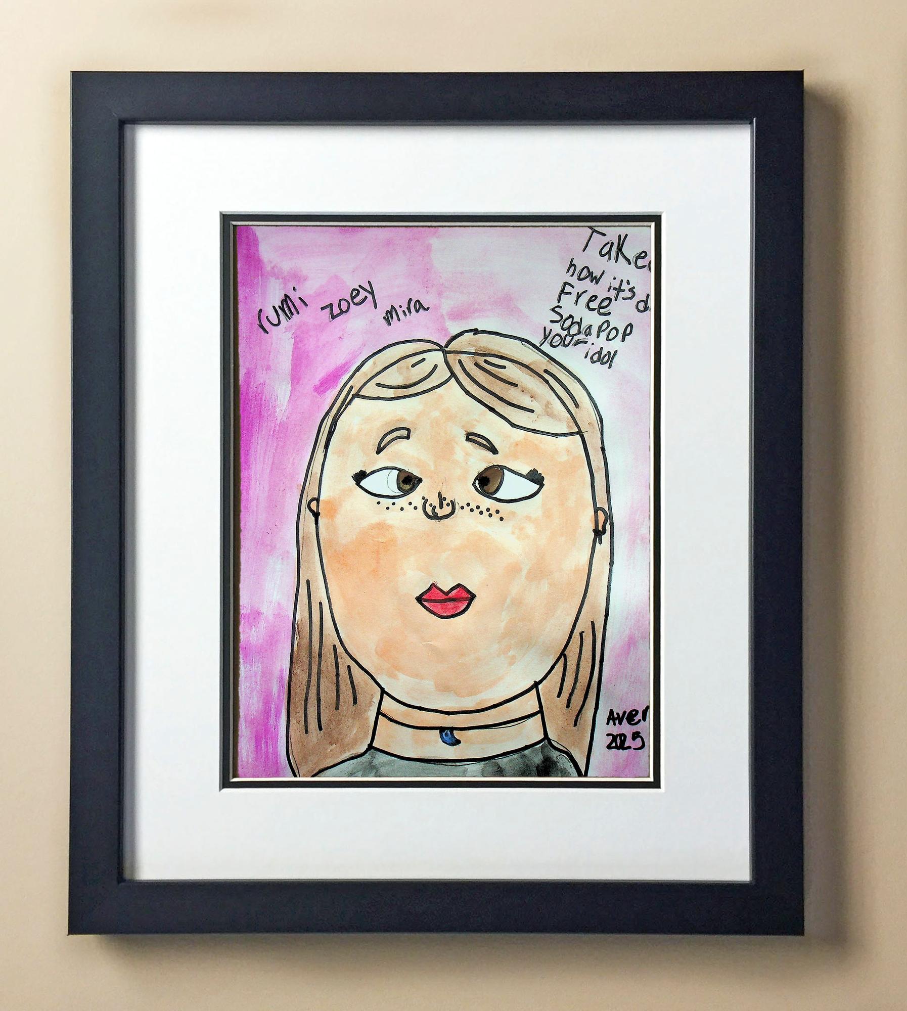 Included with the purchase is the Students Artwork, Frame, double matboard, shatter proof plexiglass, and a ready to hang backerboard with turnbuttons