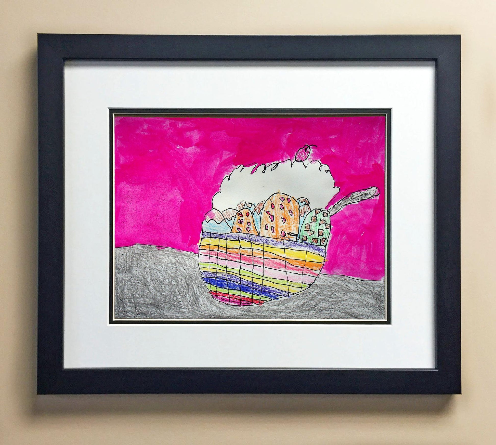Included with the purchase is the Students Artwork, Frame, double matboard, shatter proof plexiglass, and a ready to hang backerboard with turnbuttons
