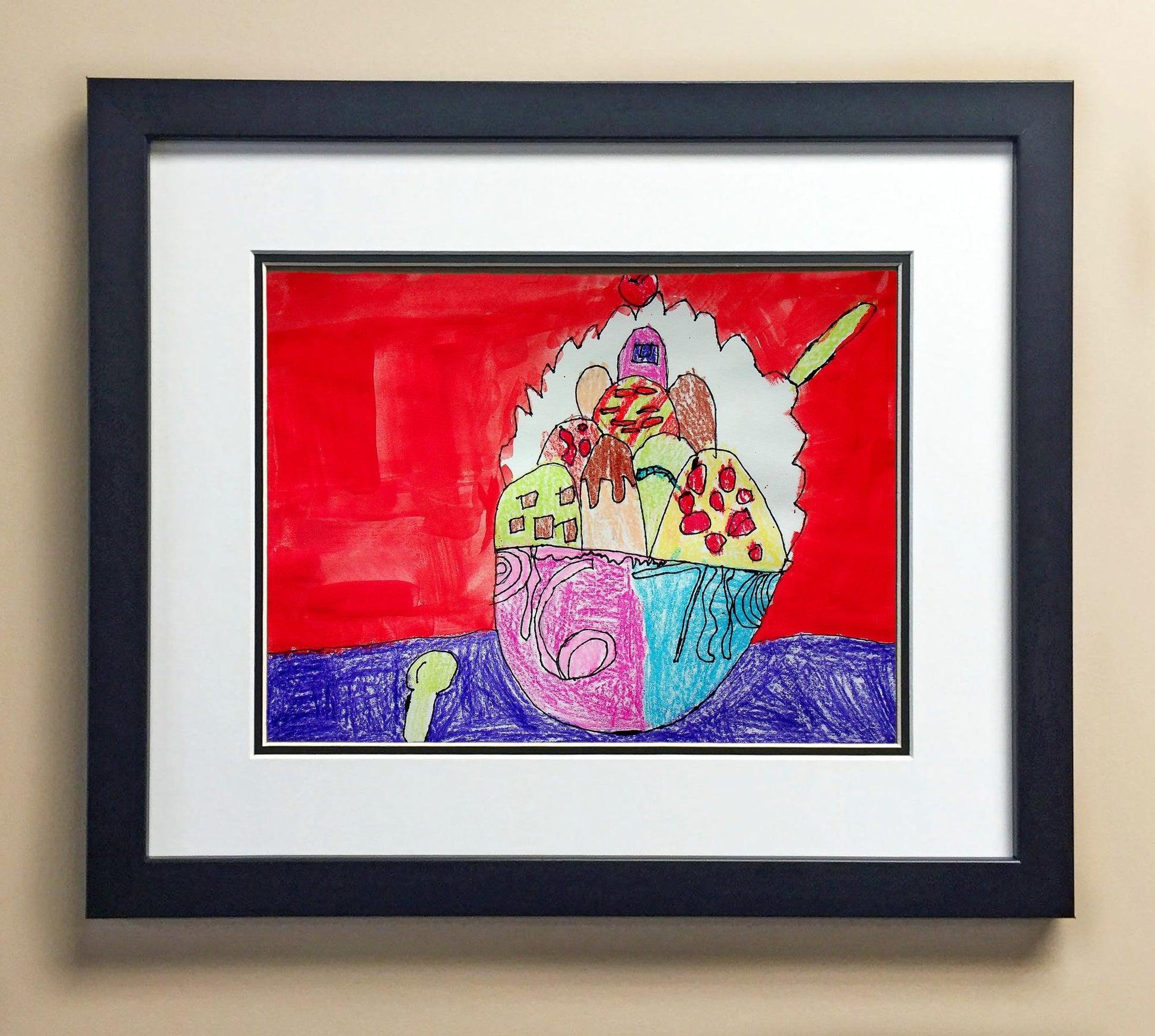 Included with the purchase is the Students Artwork, Frame, double matboard, shatter proof plexiglass, and a ready to hang backerboard with turnbuttons