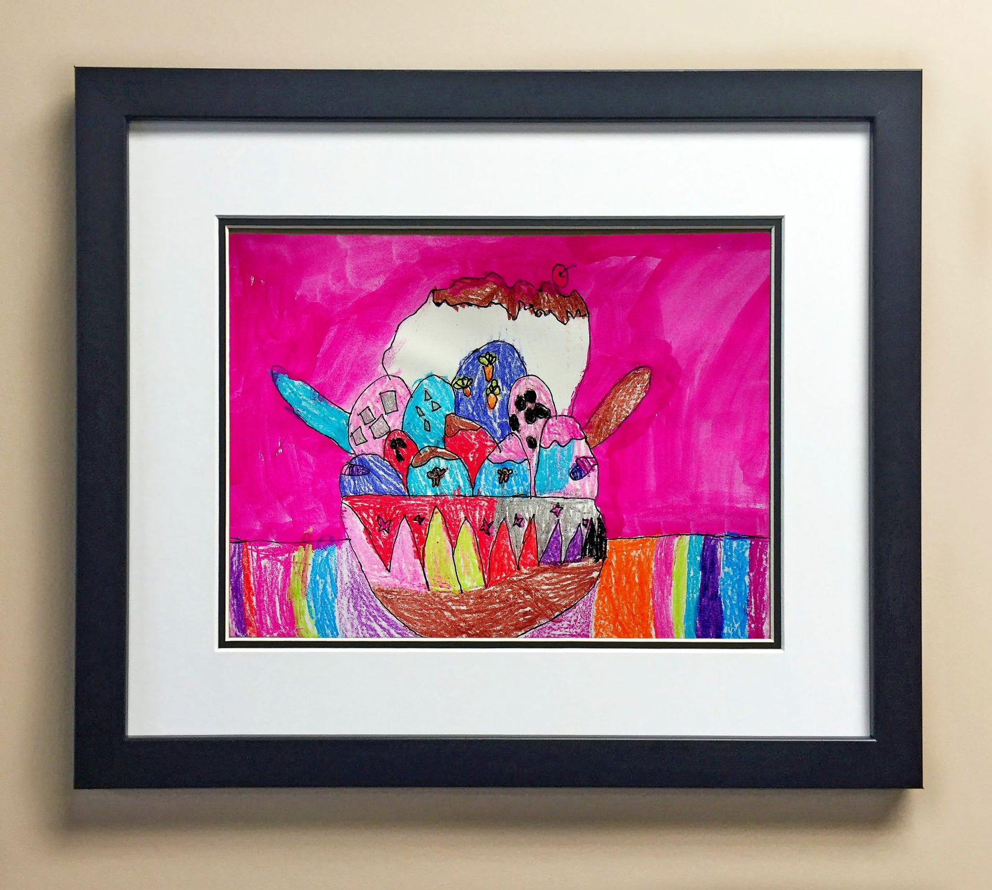 Included with the purchase is the Students Artwork, Frame, double matboard, shatter proof plexiglass, and a ready to hang backerboard with turnbuttons