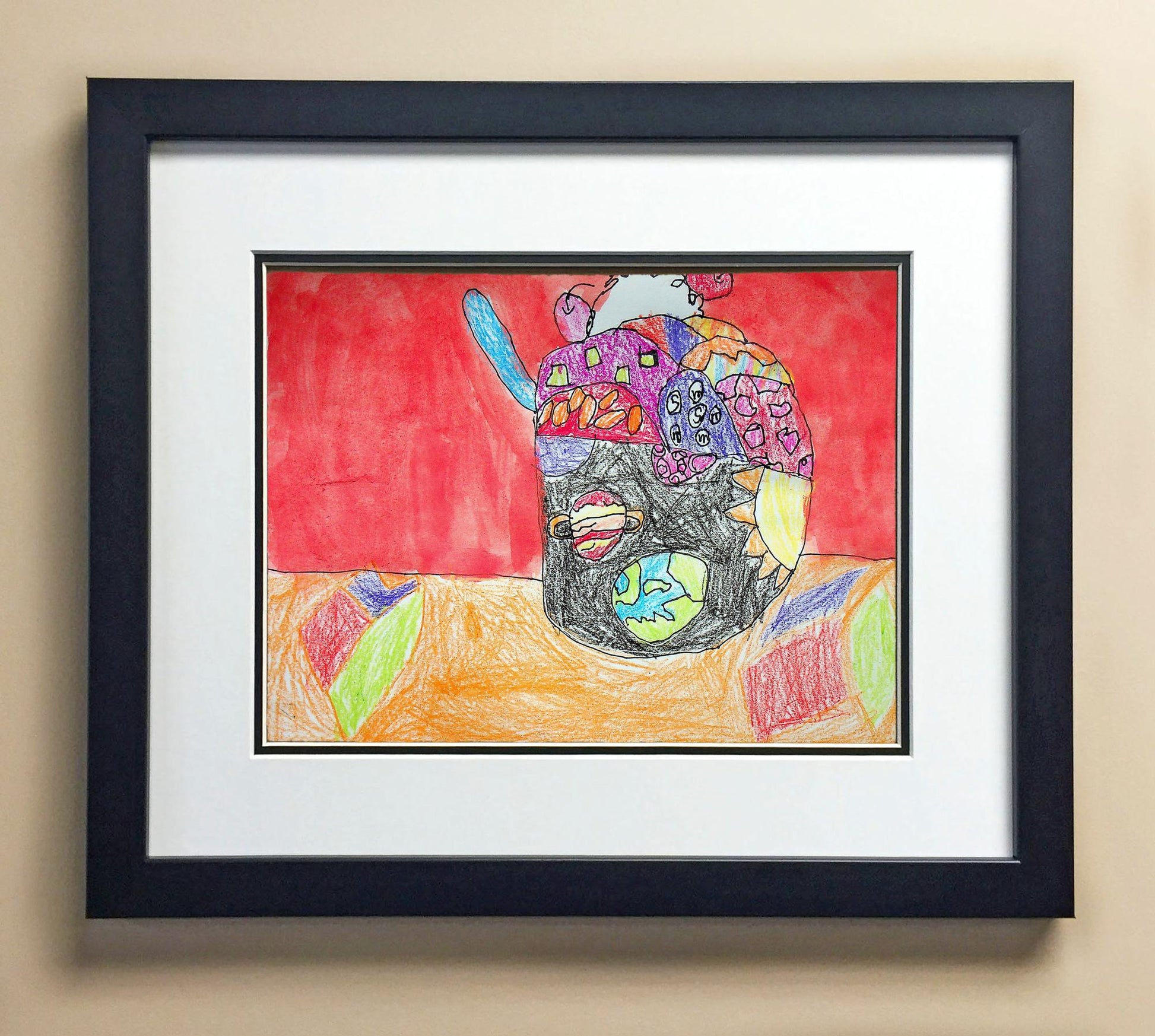 Included with the purchase is the Students Artwork, Frame, double matboard, shatter proof plexiglass, and a ready to hang backerboard with turnbuttons