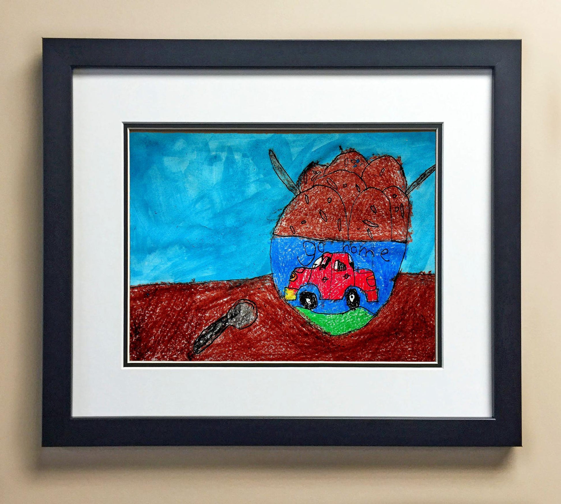 Included with the purchase is the Students Artwork, Frame, double matboard, shatter proof plexiglass, and a ready to hang backerboard with turnbuttons