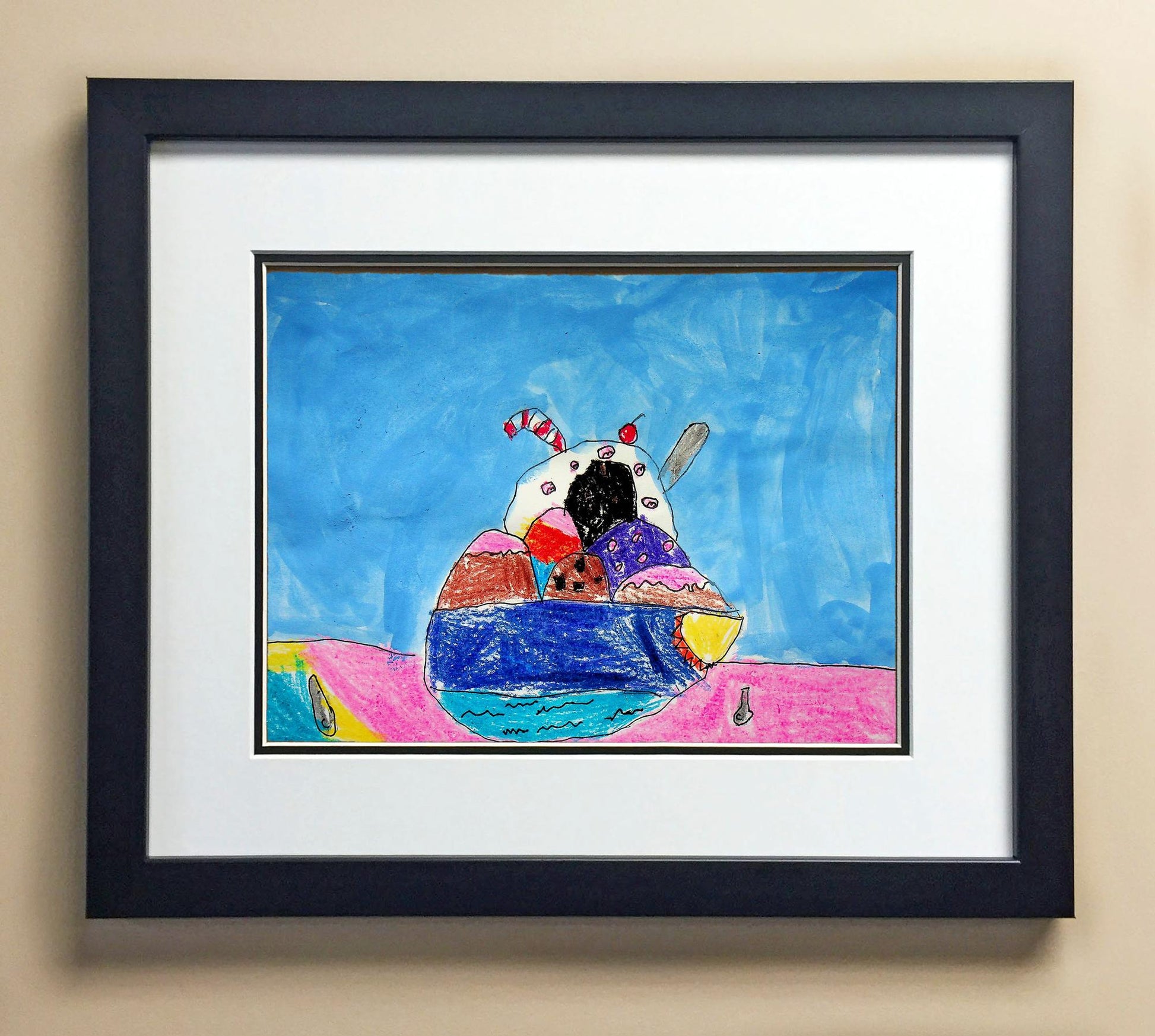 Included with the purchase is the Students Artwork, Frame, double matboard, shatter proof plexiglass, and a ready to hang backerboard with turnbuttons