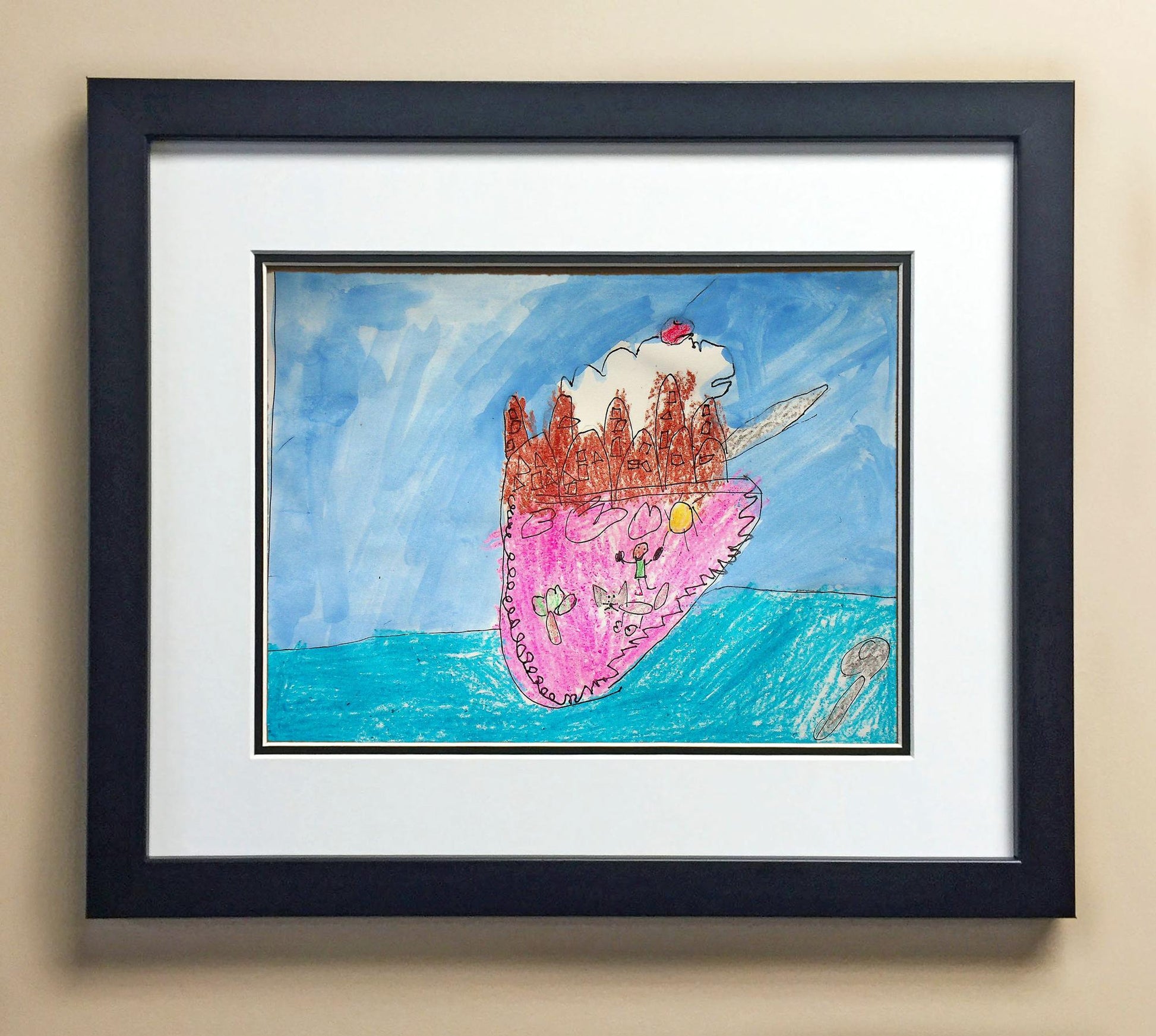 Included with the purchase is the Students Artwork, Frame, double matboard, shatter proof plexiglass, and a ready to hang backerboard with turnbuttons
