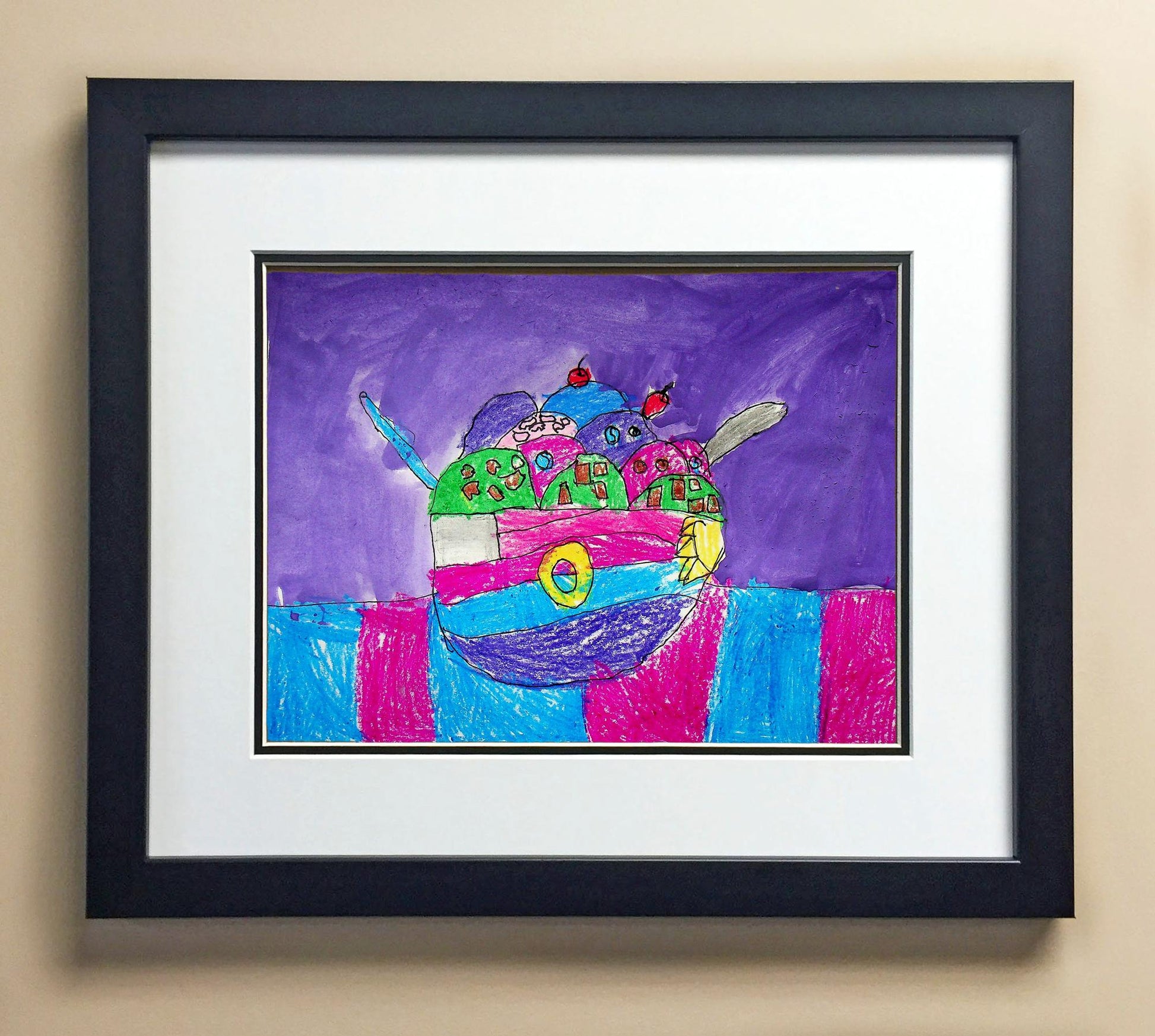 Included with the purchase is the Students Artwork, Frame, double matboard, shatter proof plexiglass, and a ready to hang backerboard with turnbuttons