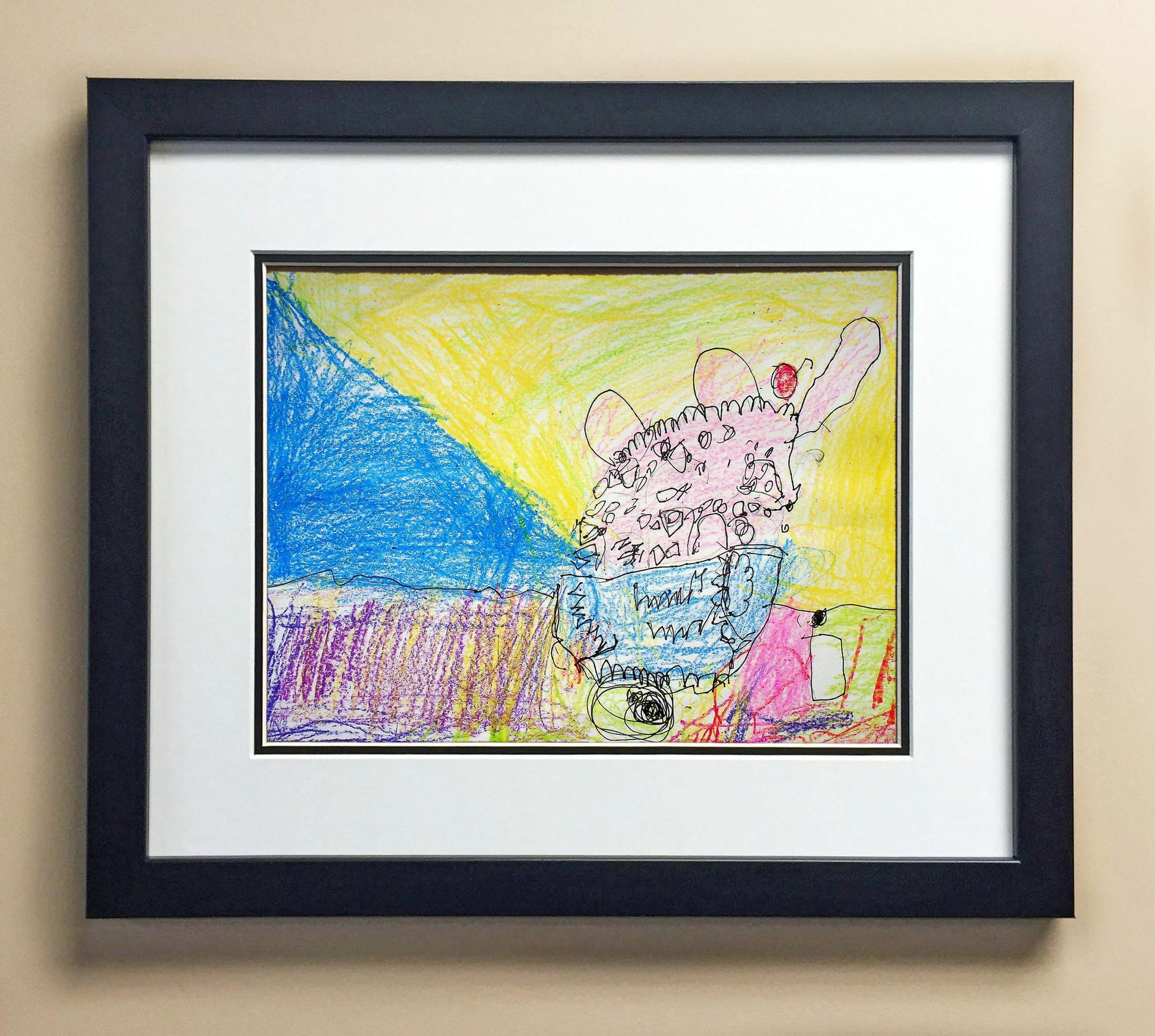 Included with the purchase is the Students Artwork, Frame, double matboard, shatter proof plexiglass, and a ready to hang backerboard with turnbuttons
