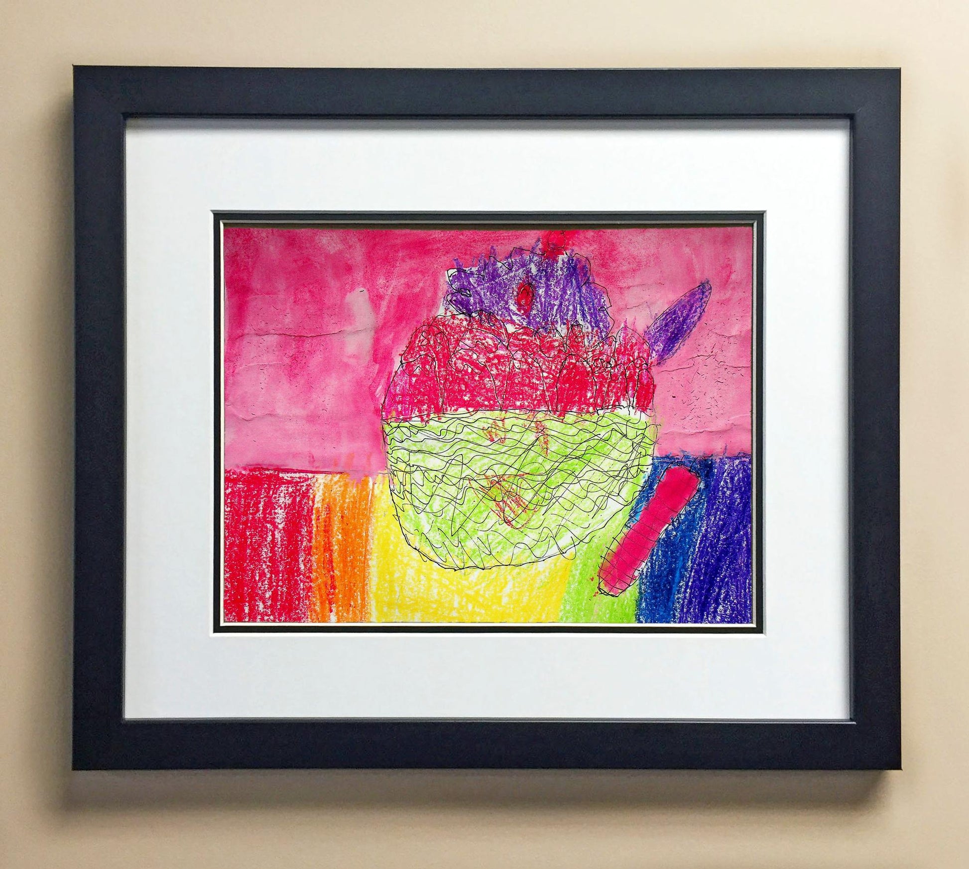 Included with the purchase is the Students Artwork, Frame, double matboard, shatter proof plexiglass, and a ready to hang backerboard with turnbuttons