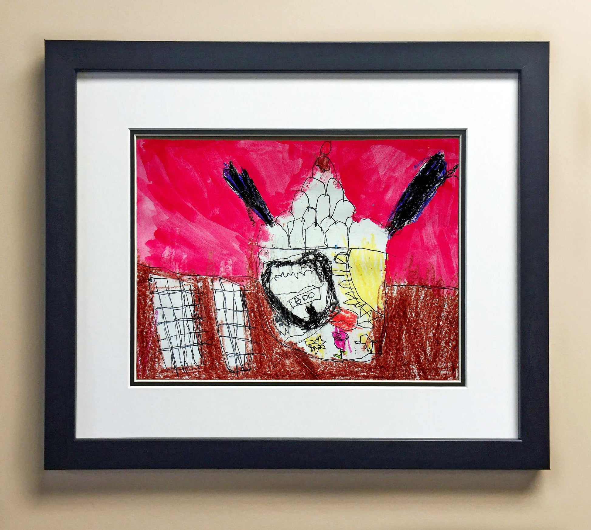 Included with the purchase is the Students Artwork, Frame, double matboard, shatter proof plexiglass, and a ready to hang backerboard with turnbuttons