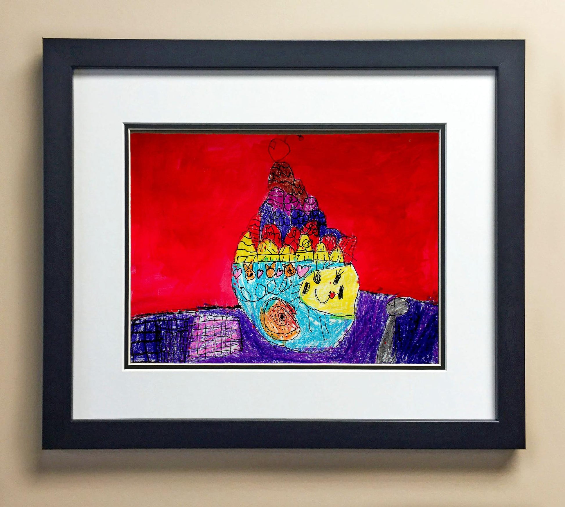 Included with the purchase is the Students Artwork, Frame, double matboard, shatter proof plexiglass, and a ready to hang backerboard with turnbuttons