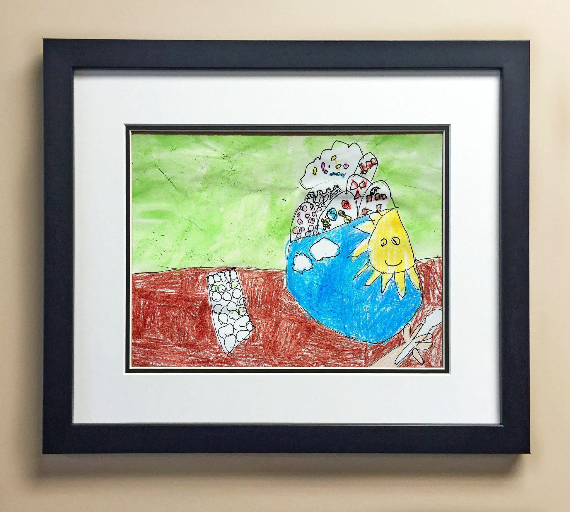 Included with the purchase is the Students Artwork, Frame, double matboard, shatter proof plexiglass, and a ready to hang backerboard with turnbuttons