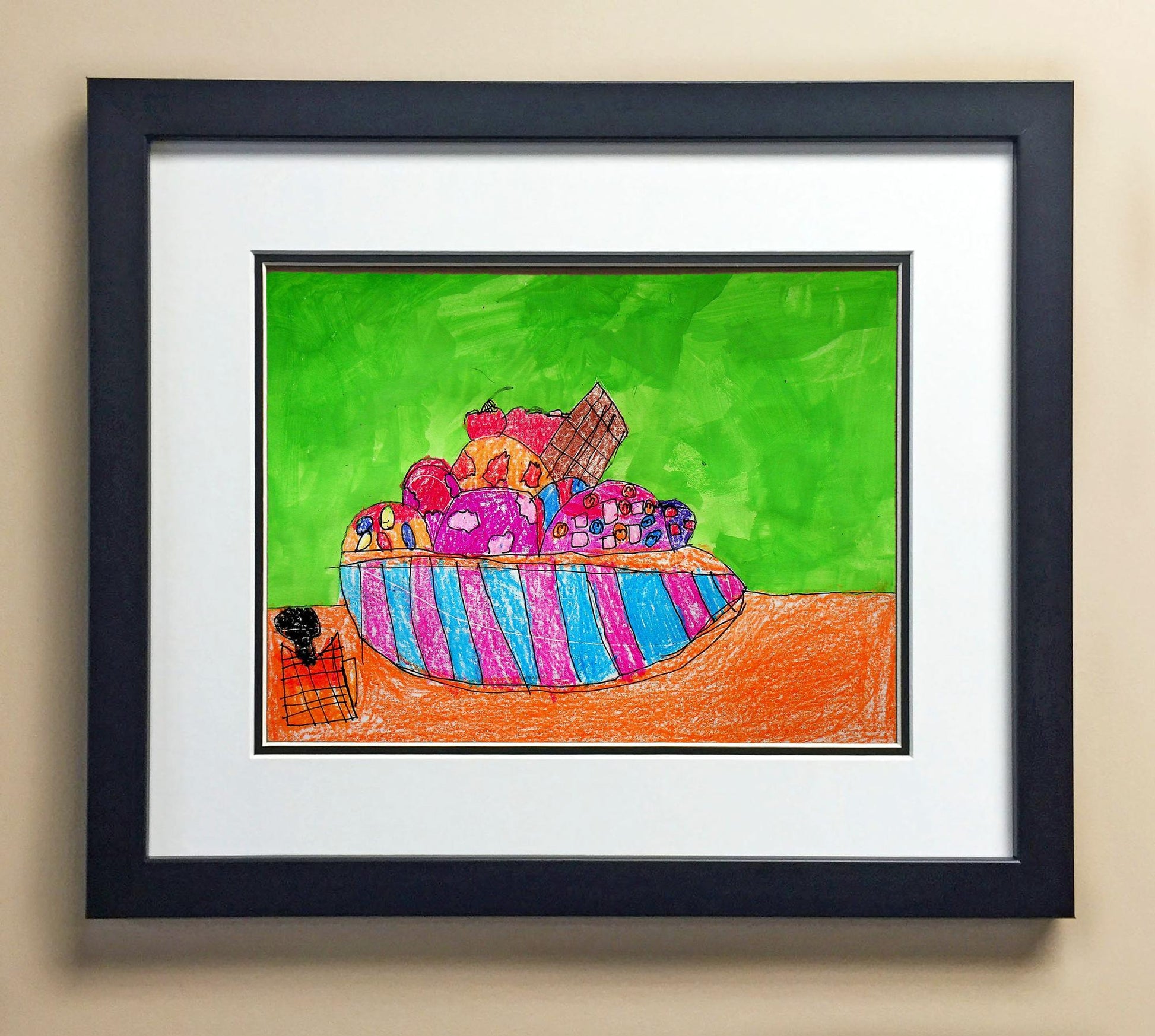 Included with the purchase is the Students Artwork, Frame, double matboard, shatter proof plexiglass, and a ready to hang backerboard with turnbuttons