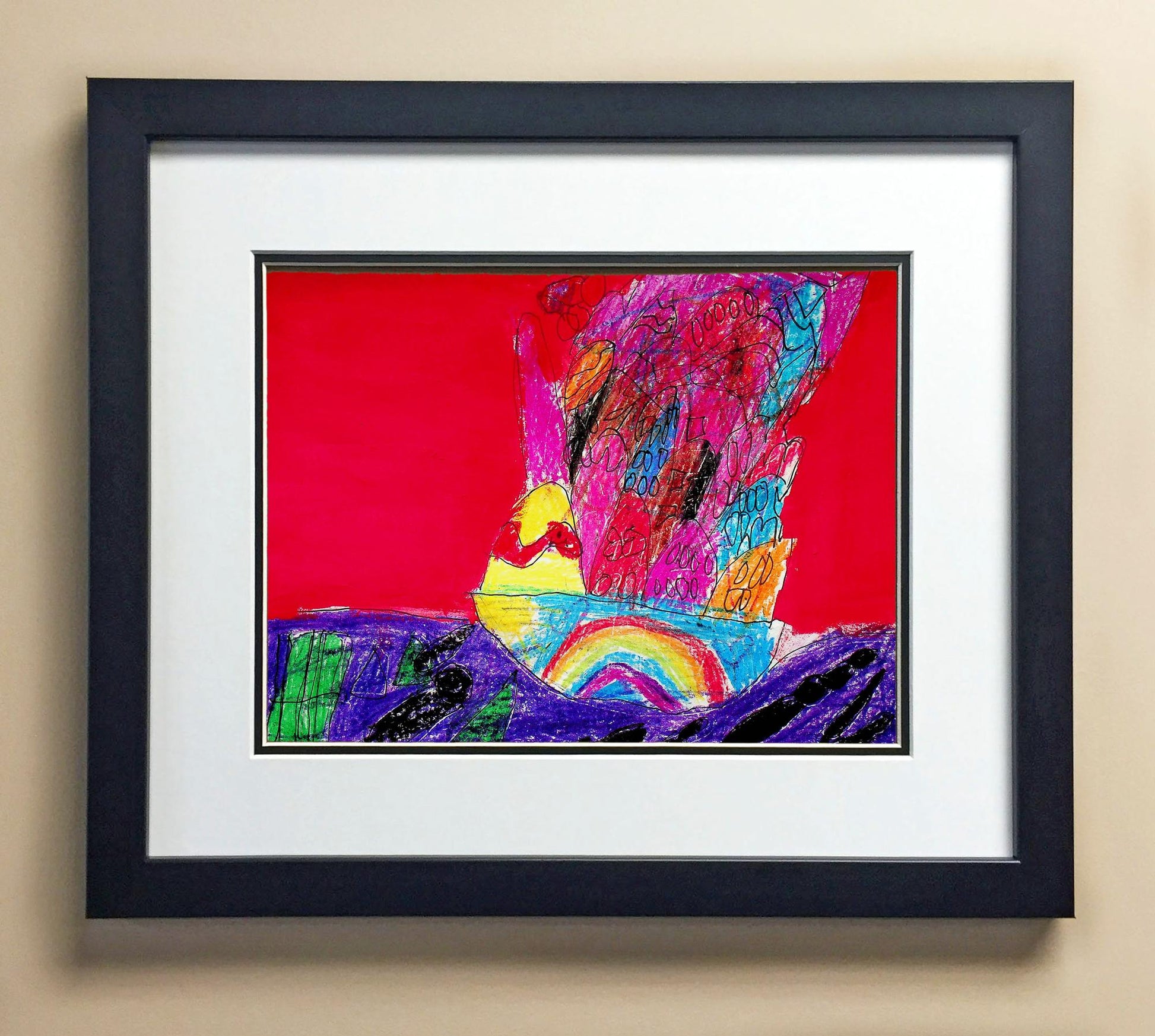 Included with the purchase is the Students Artwork, Frame, double matboard, shatter proof plexiglass, and a ready to hang backerboard with turnbuttons
