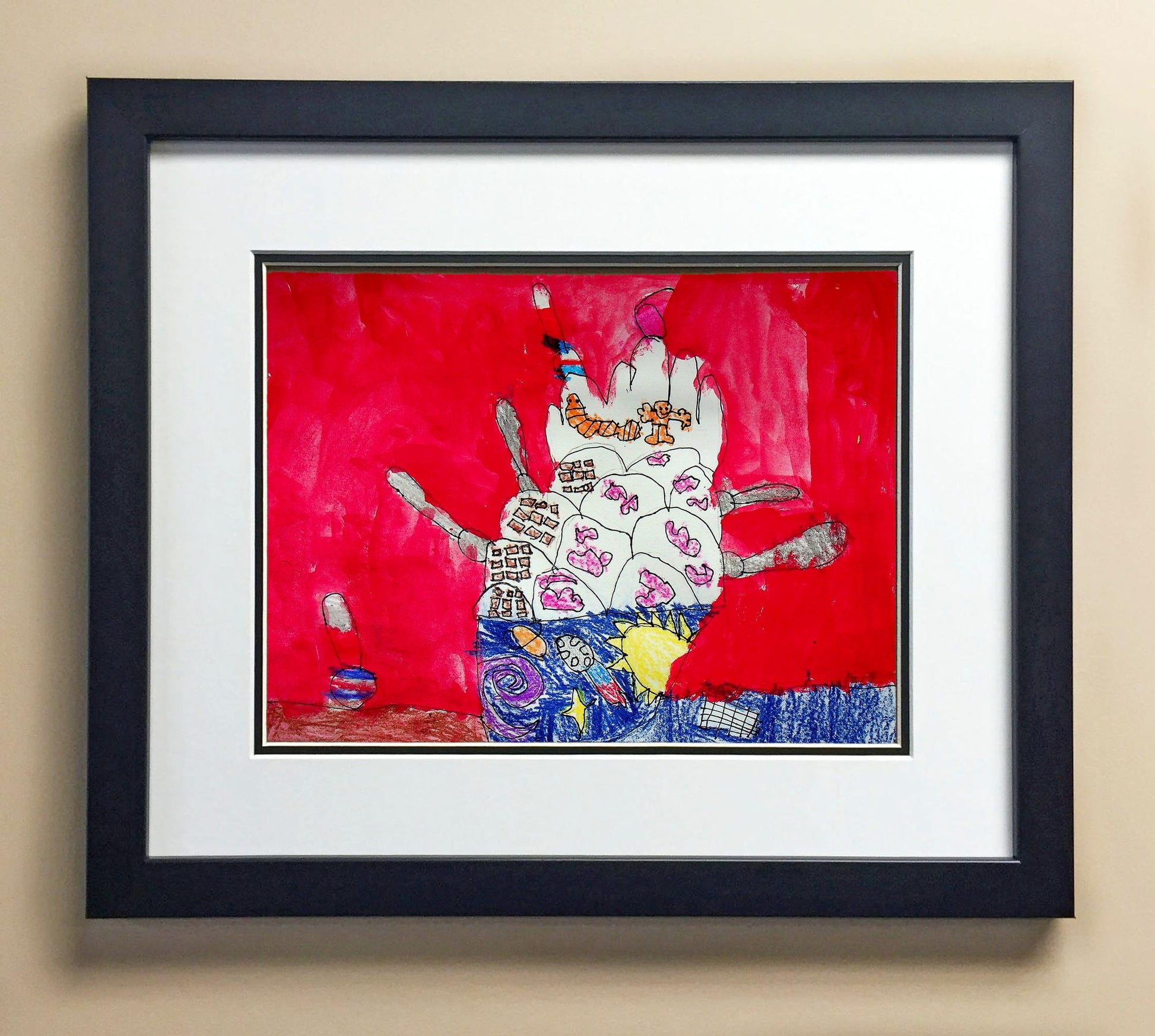 Included with the purchase is the Students Artwork, Frame, double matboard, shatter proof plexiglass, and a ready to hang backerboard with turnbuttons