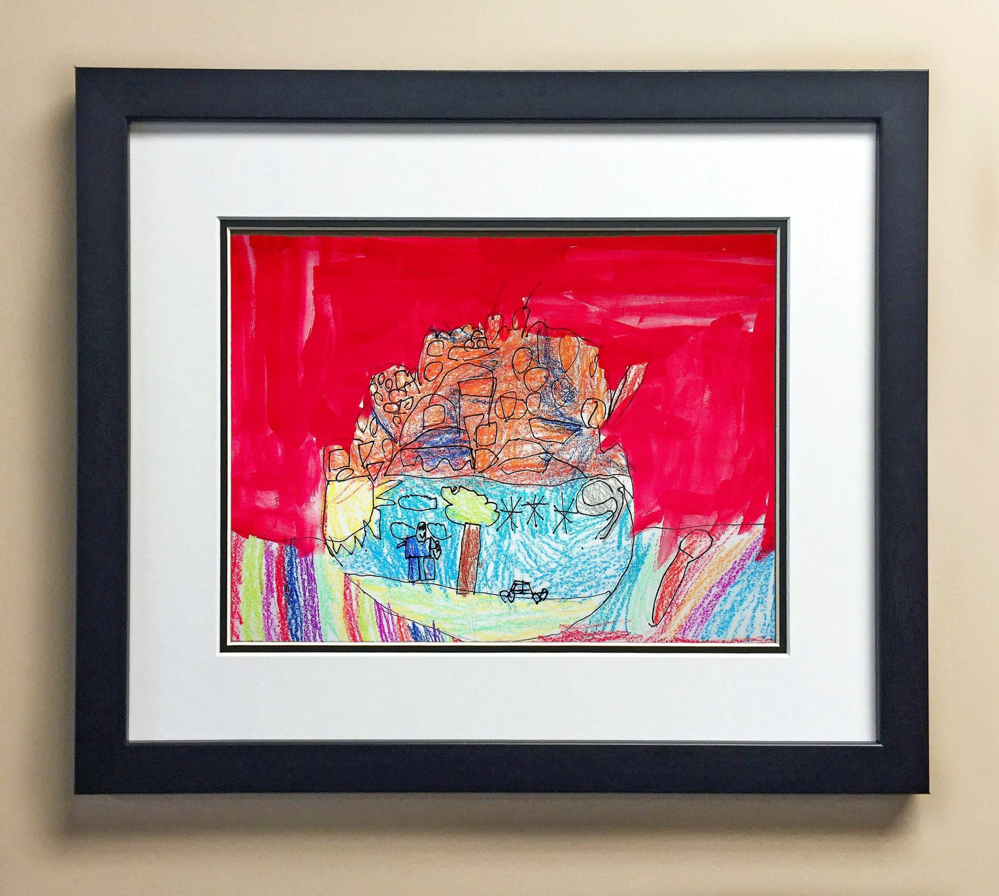Included with the purchase is the Students Artwork, Frame, double matboard, shatter proof plexiglass, and a ready to hang backerboard with turnbuttons