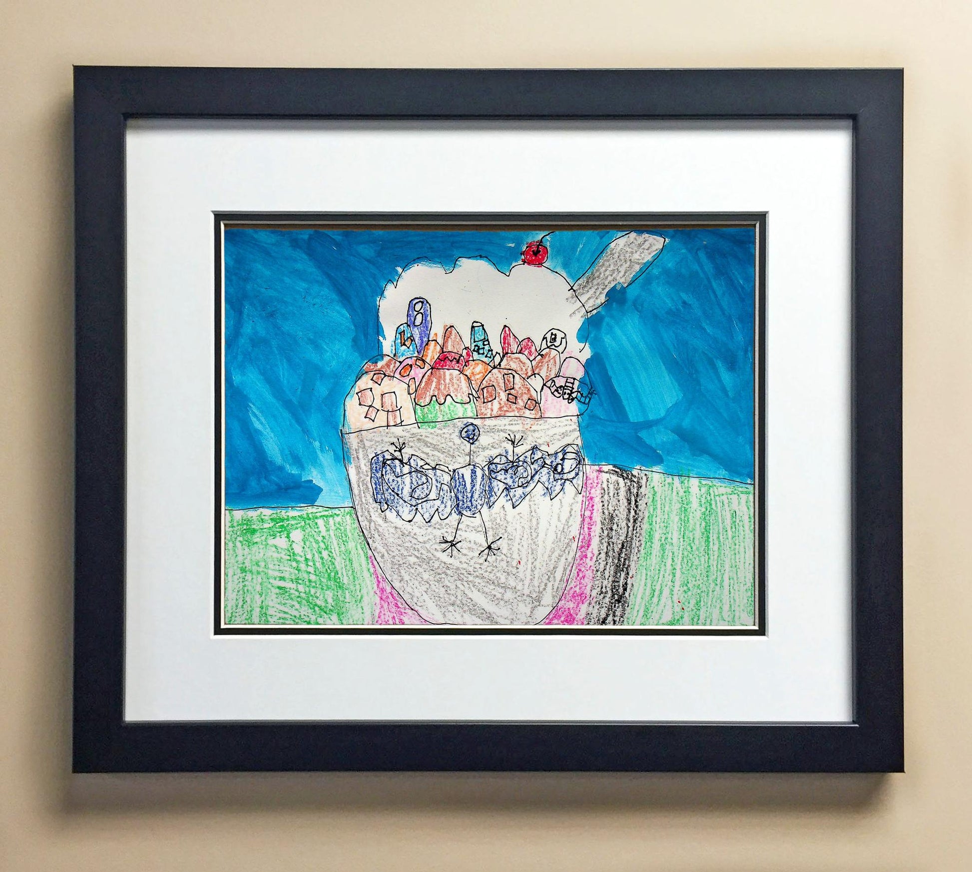 Included with the purchase is the Students Artwork, Frame, double matboard, shatter proof plexiglass, and a ready to hang backerboard with turnbuttons