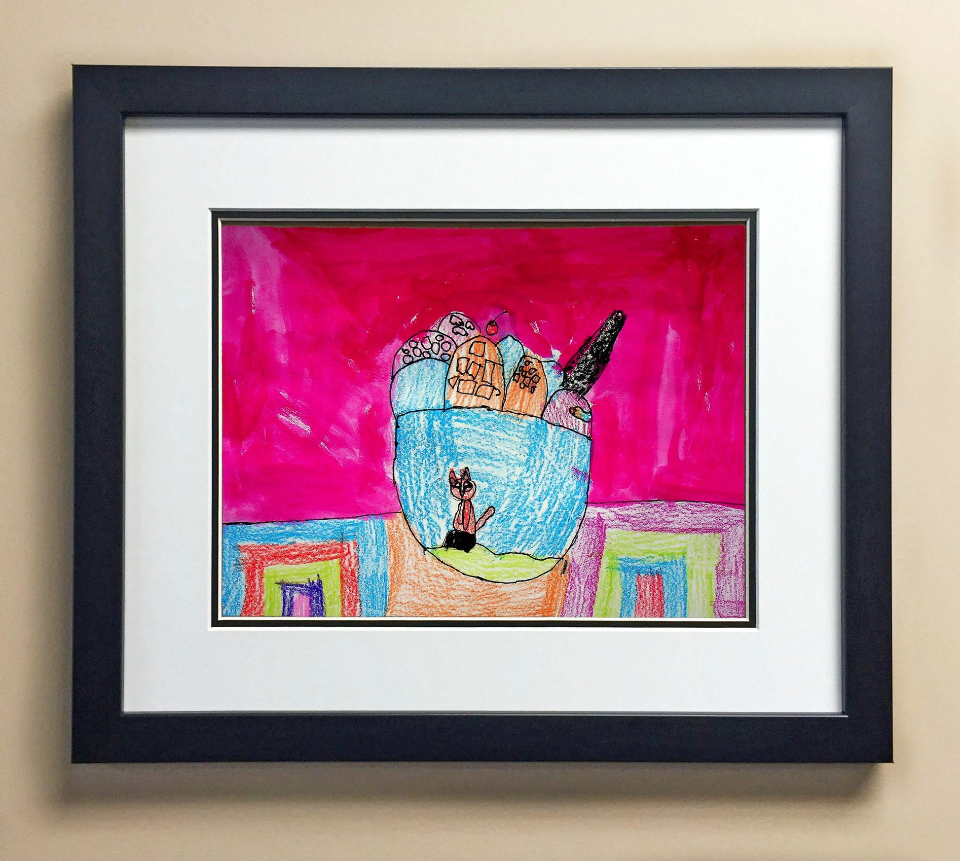 Included with the purchase is the Students Artwork, Frame, double matboard, shatter proof plexiglass, and a ready to hang backerboard with turnbuttons