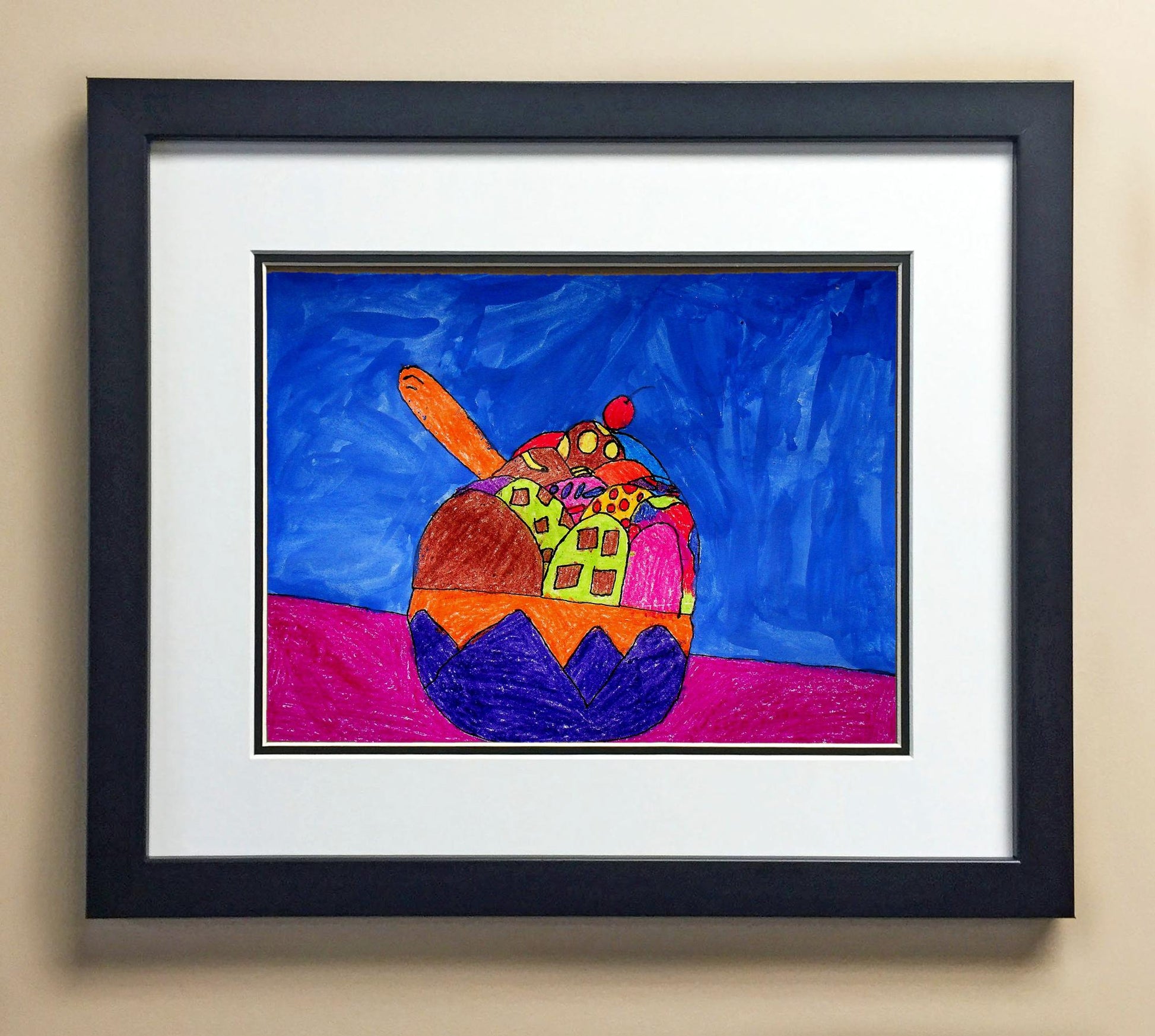 Included with the purchase is the Students Artwork, Frame, double matboard, shatter proof plexiglass, and a ready to hang backerboard with turnbuttons
